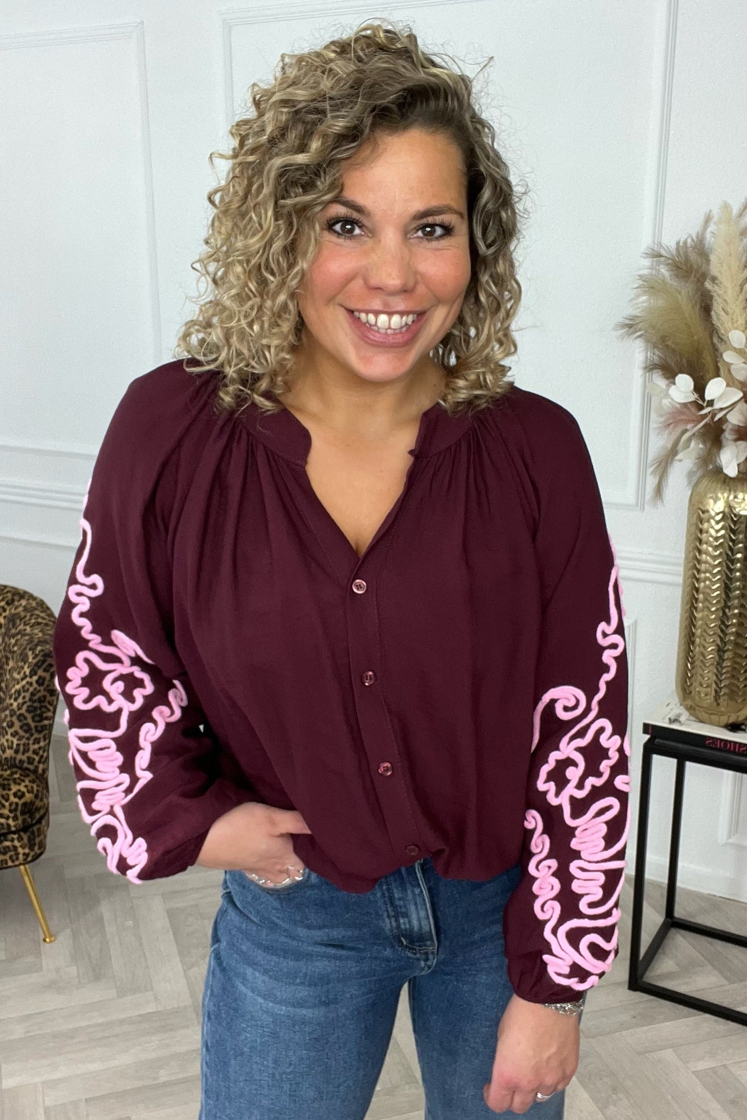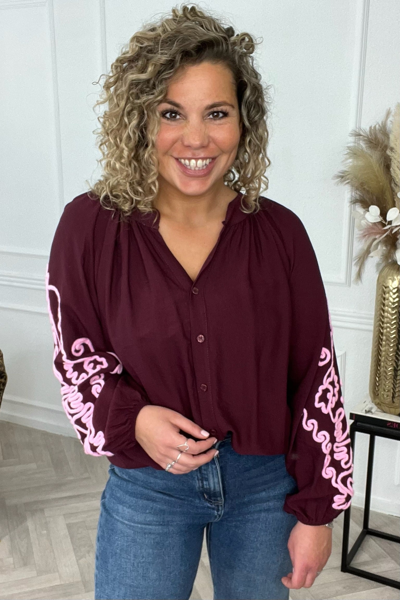 Een hele leuke blouse met een geborduurde roze print op de balloon mouwen! Echt perfect om deze in je kast te hebben liggen! Shop de balloon broderie sleeve daarom nu snel in bordeaux.