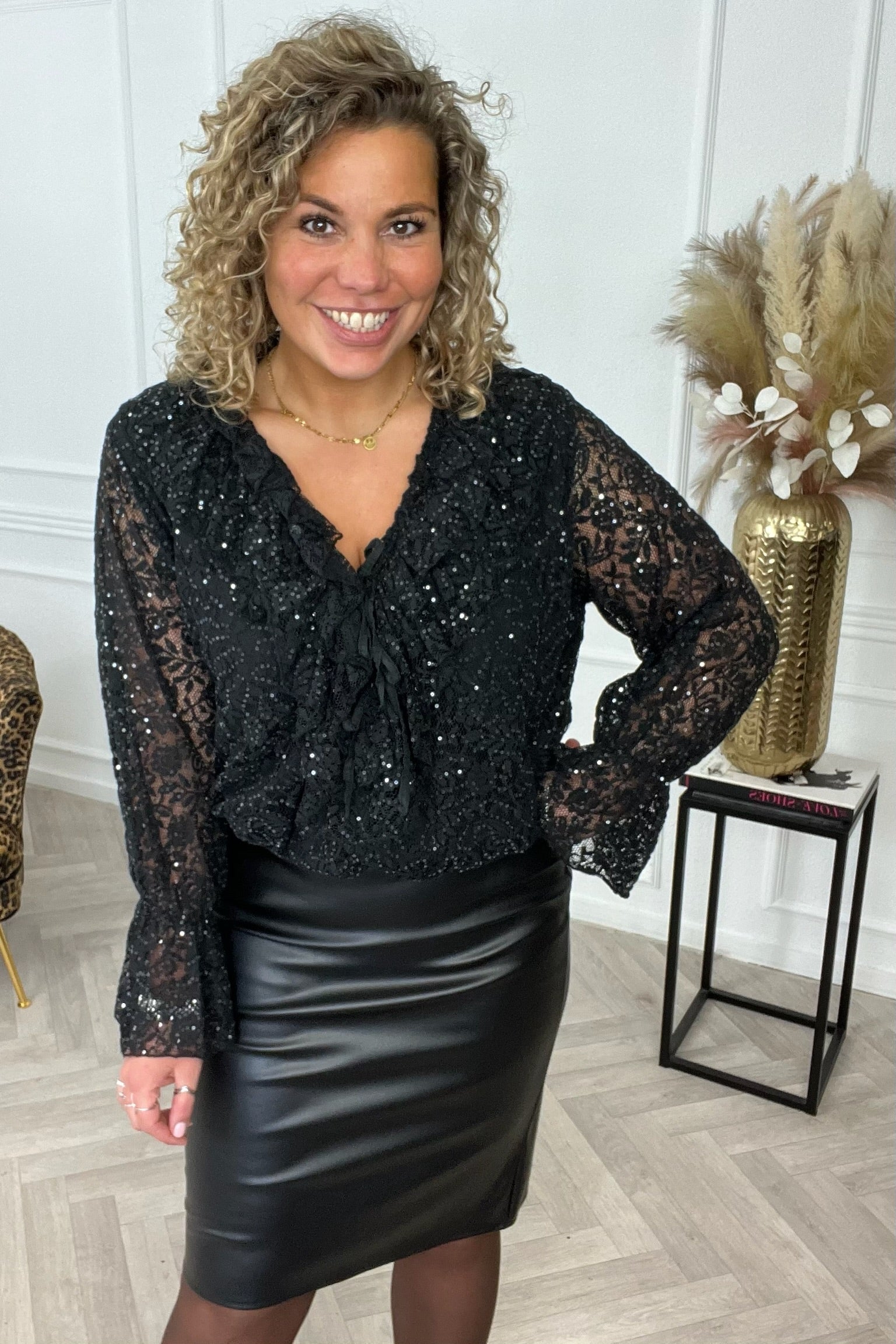 Een super leuke lace blouse met subtiele pailletten erin! Bij de v-hals heeft de blouse ruffles en touwtjes om een strik mee te maken. Shop de glitter ruffle lace blouse nu in black!