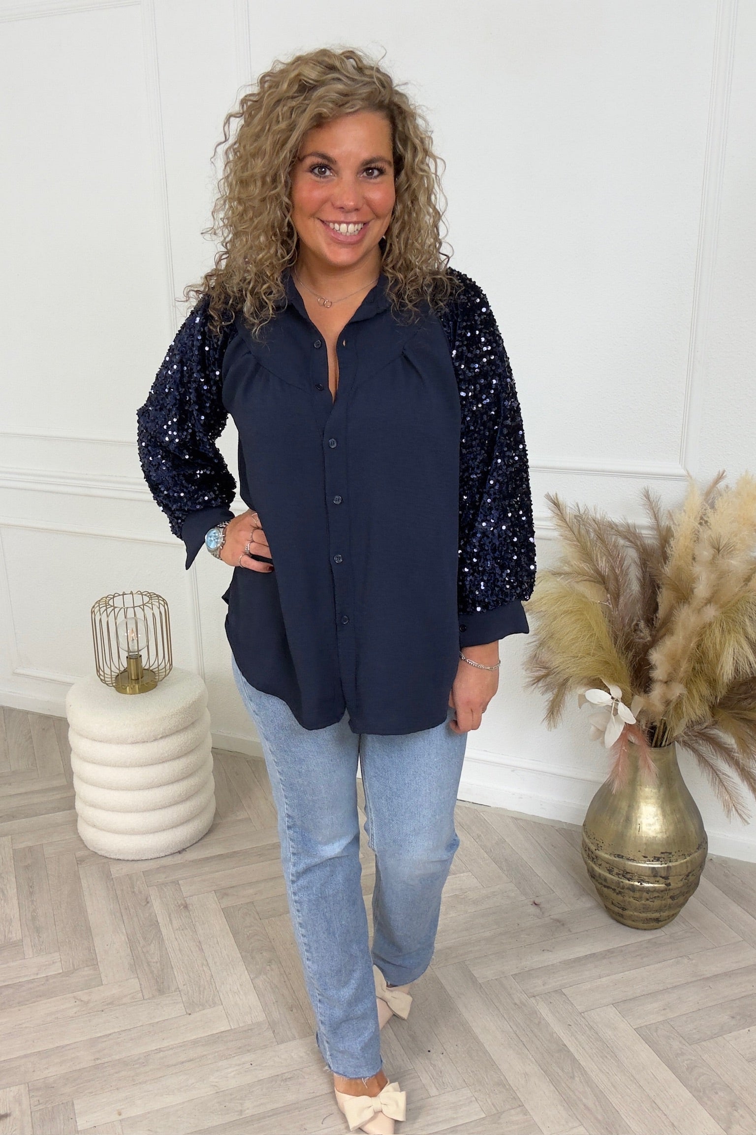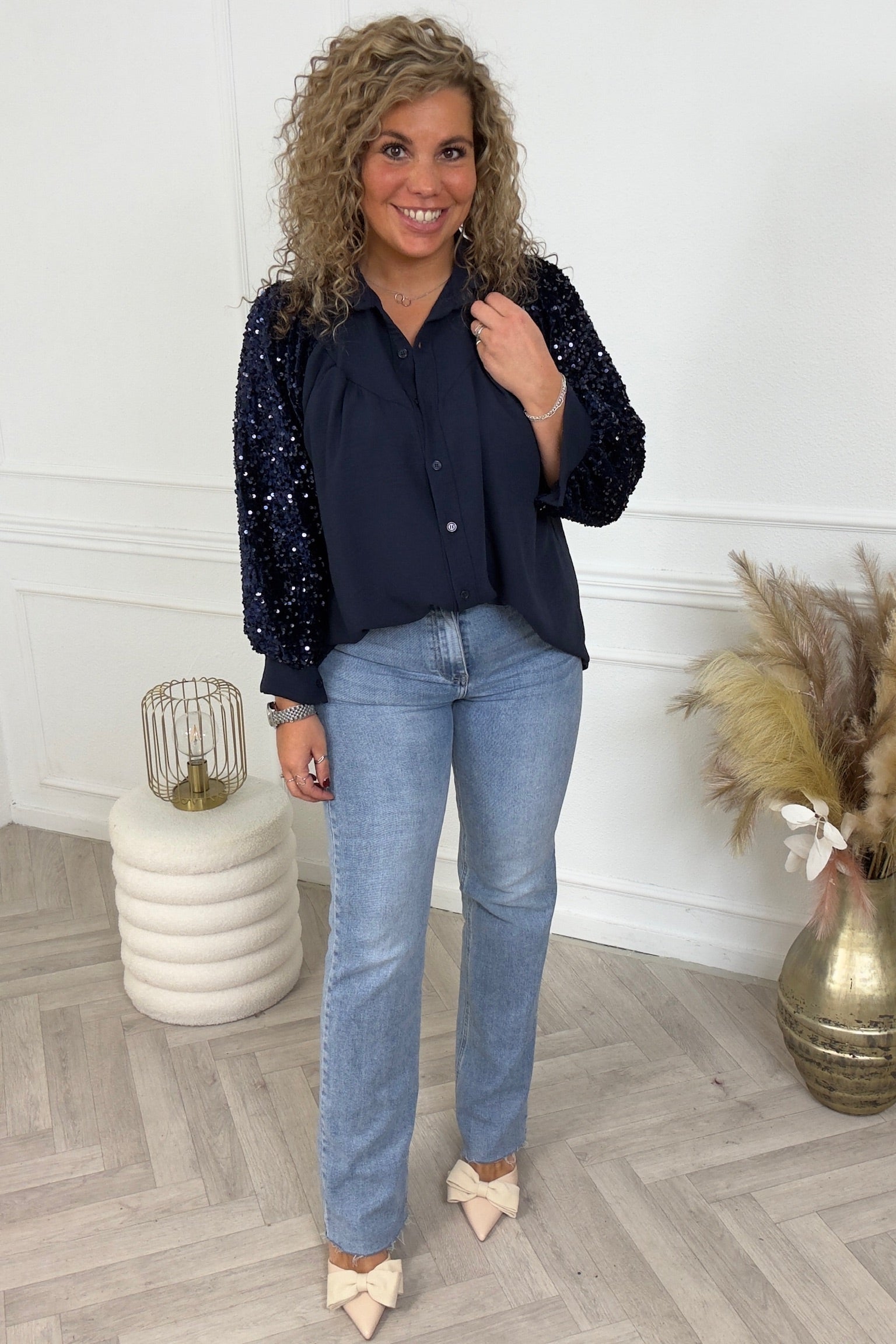 We hebben een super leuke blouse binnen met glitters. Ideaal voor de feestdagen! Shop hem nu in navy.