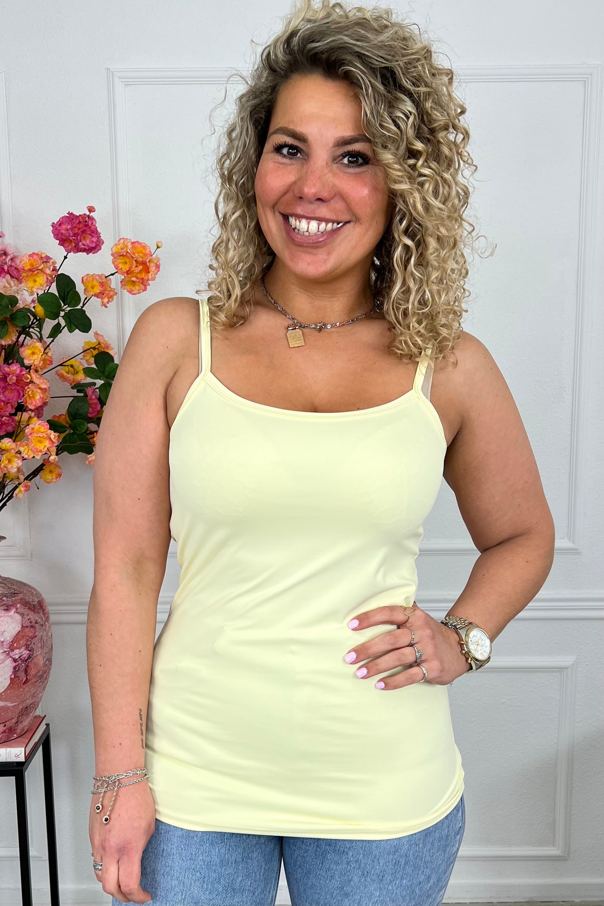 Deze heerlijke topjes zijn de perfecte basic! Ze zijn leuk te dragen onder een onze andere musthaves, zoals een jasje! Shop hem nu in yellow!