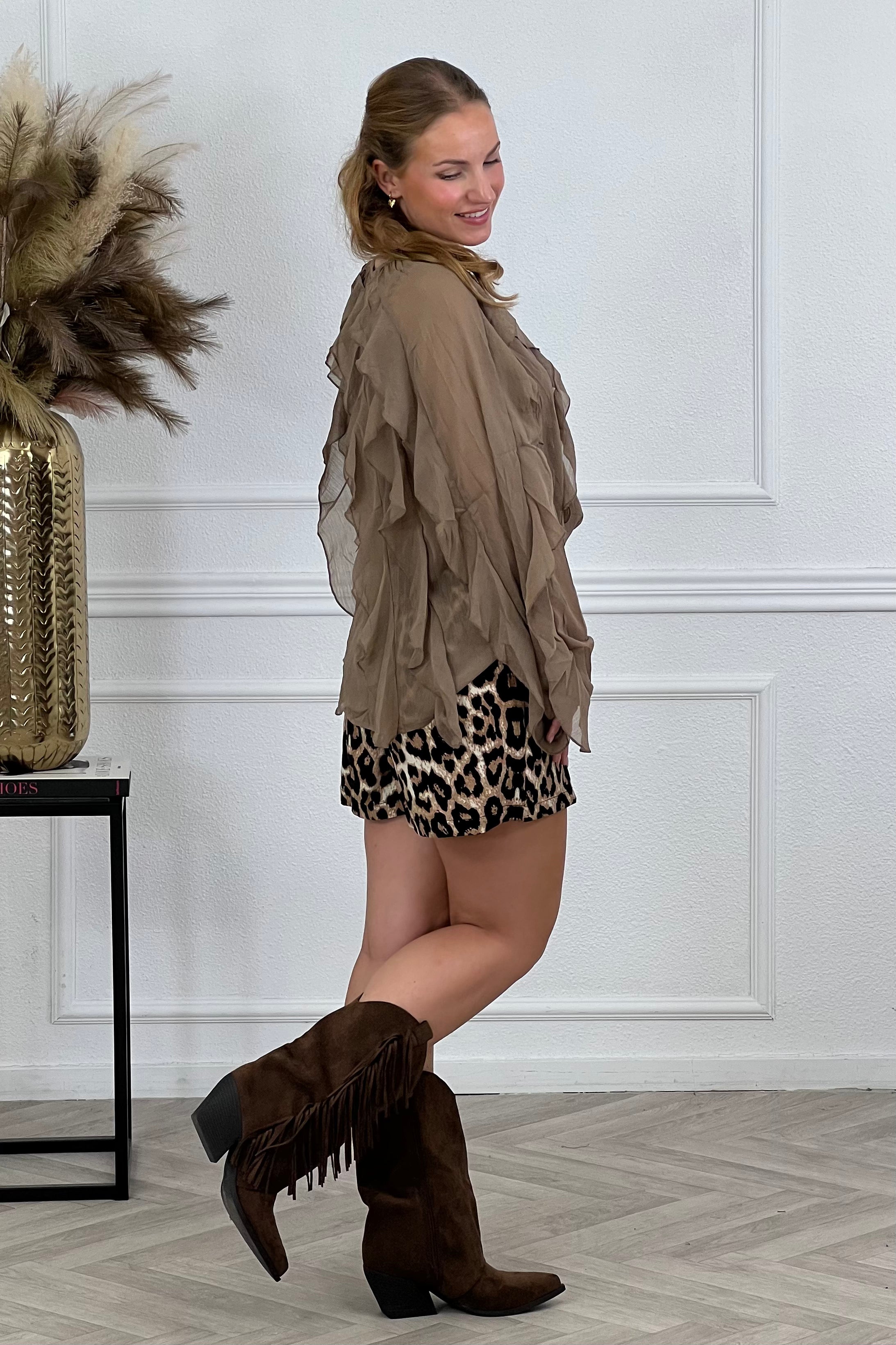 Shop deze mooie blouse met heerlijke ruffles nu in het Taupe!