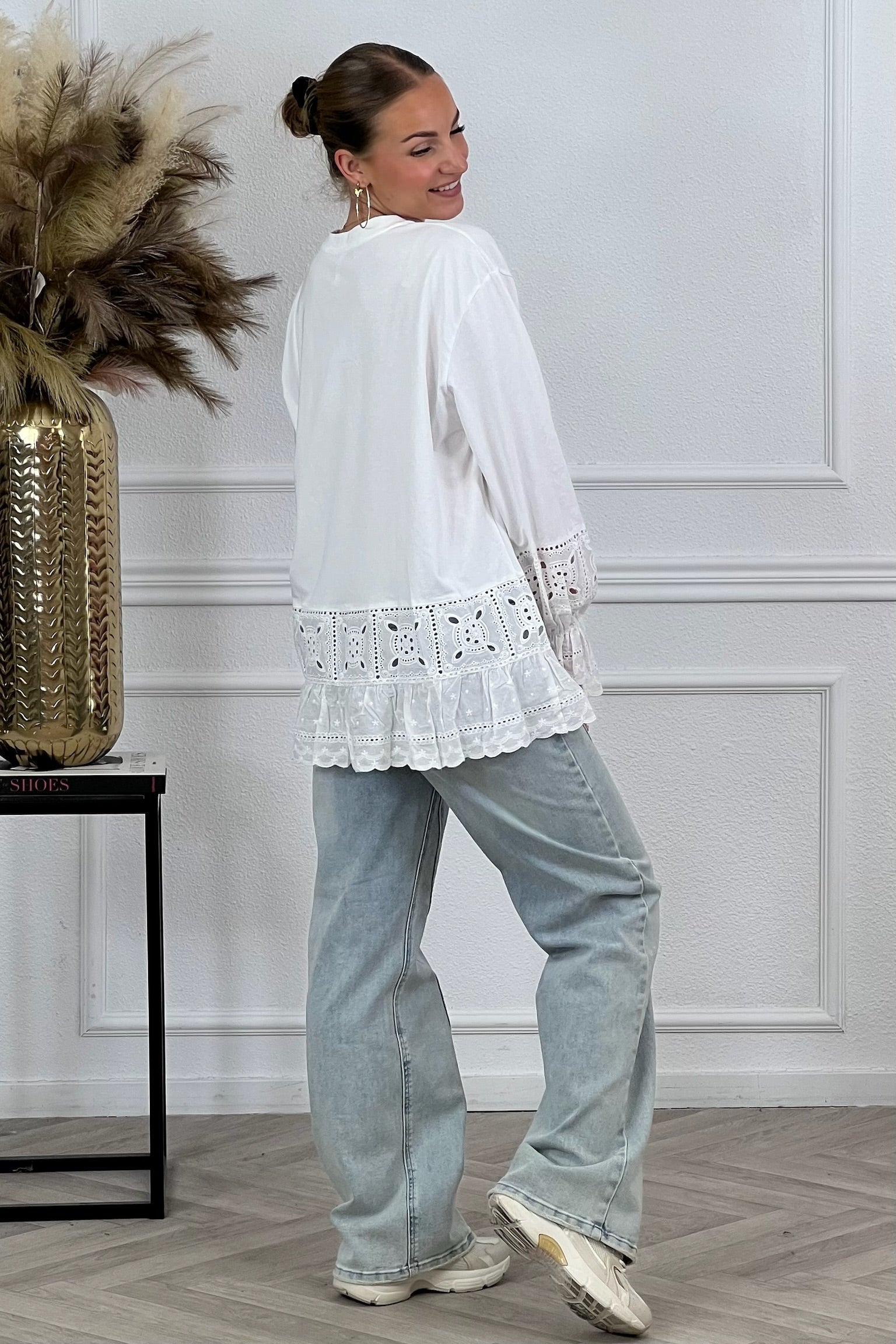 Dit heerlijke lange shirt met een kanten onderkant is lekker lang! Een fijn shirt om in je kast te hebben, dus shop hem nu snel!