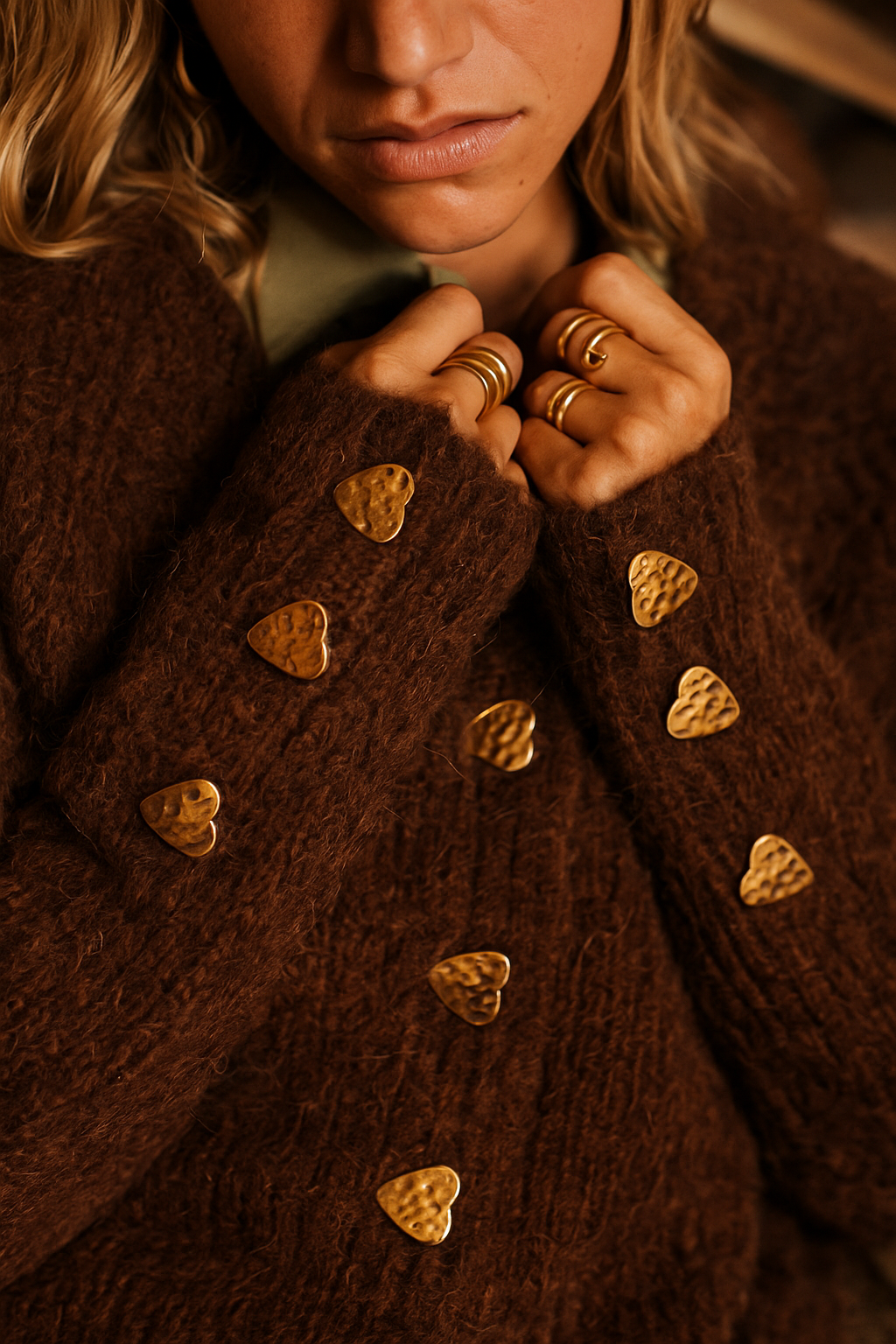 Wat een fijn nieuw vest, met mooie hartendetails. Het vest is brown, en de harten komen ook terug in de knopen. Shop hem nu nieuw in brown!