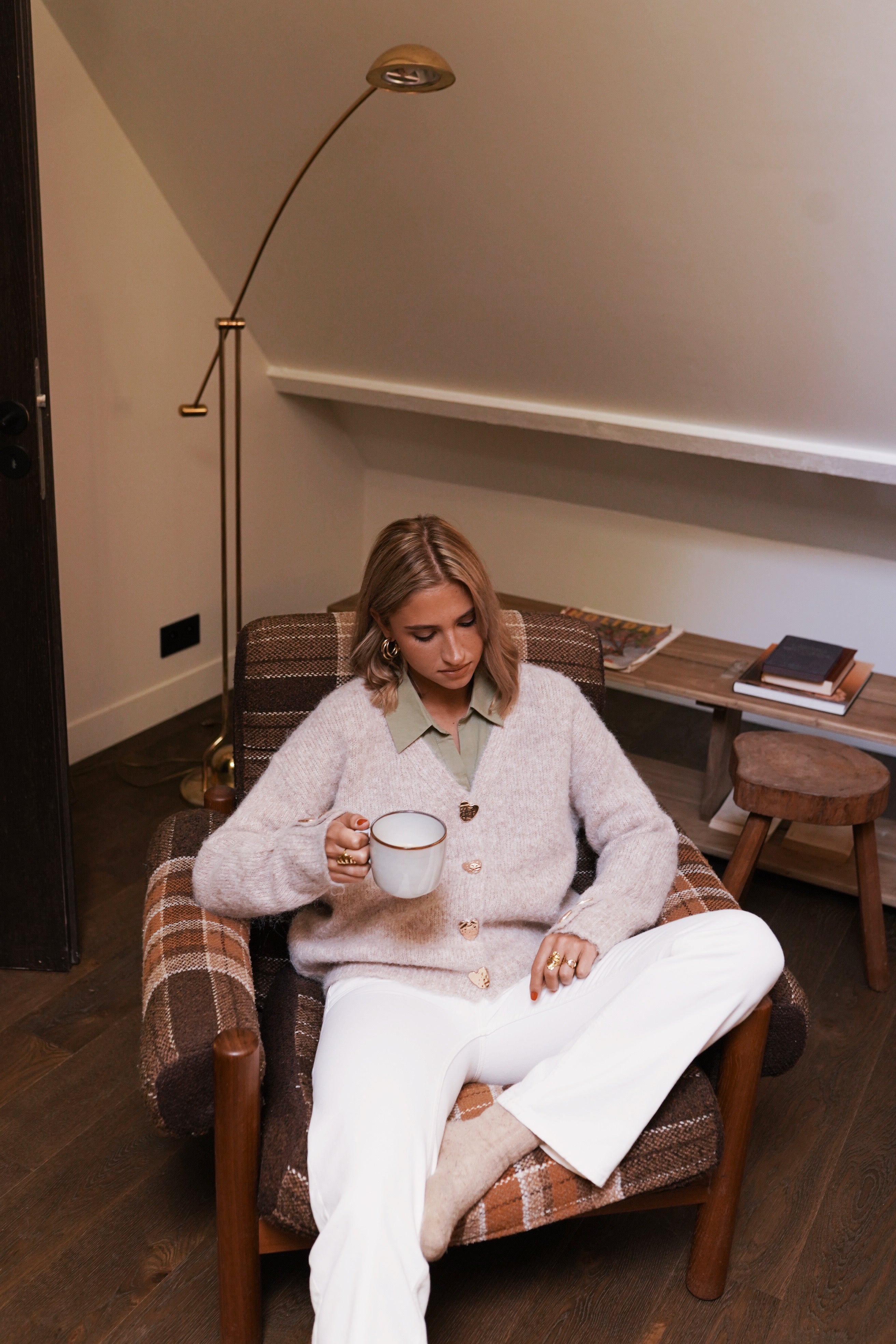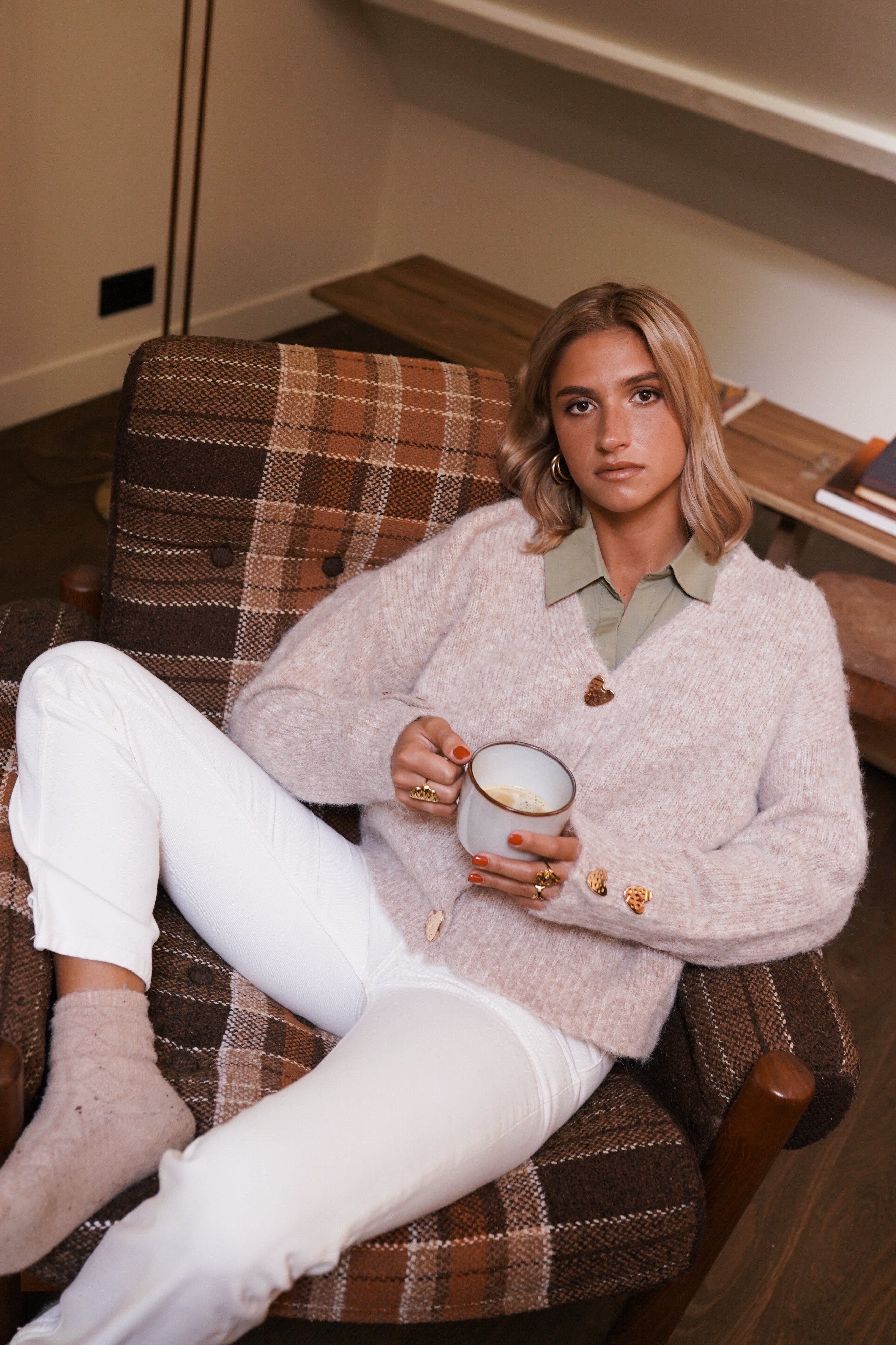 Wat een fijn nieuw vest, met mooie hartendetails. Het vest is licht-taupe, en de harten komen ook terug in de knopen. Shop hem nu nieuw online!