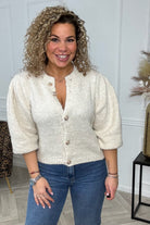 Dit korte knitted vestje heeft mooie knoopjes en puffy mouwtjes. Een echte musthave voor de lente! Shop hem in beige!