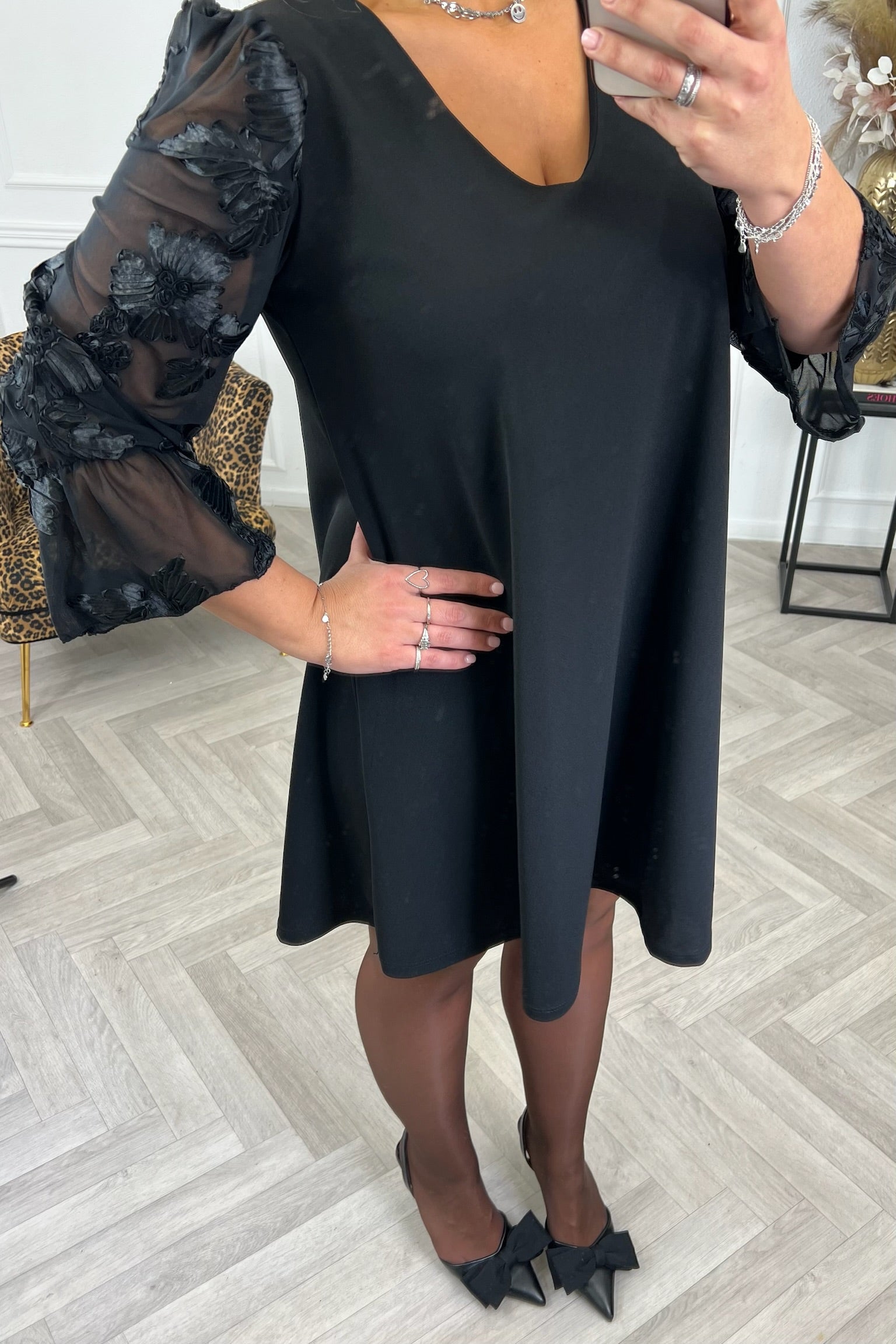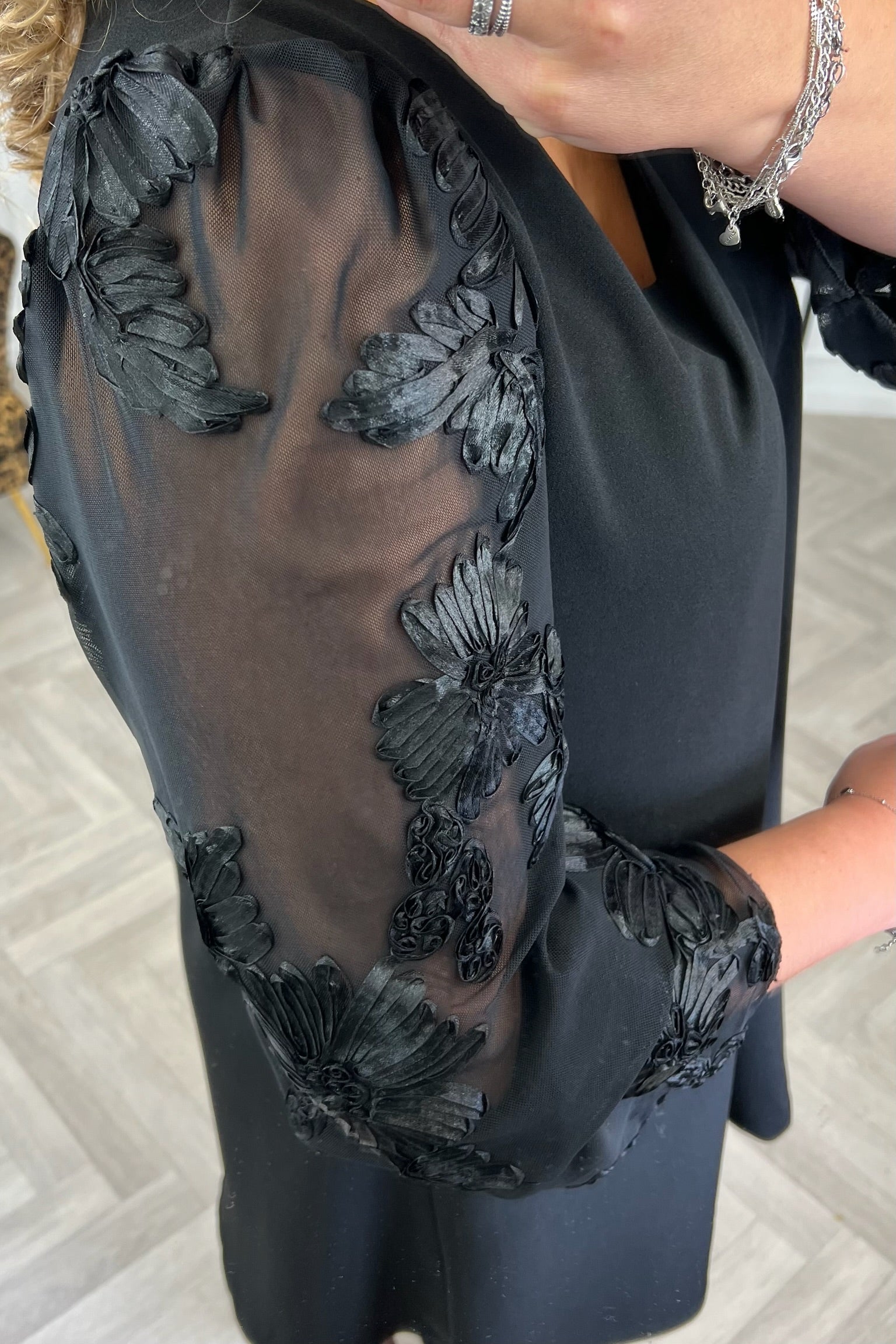 Een prachtige jurk! Basic, maar door de doorzichtige mouwen met bloemen helemaal af! De jurk is een a-line en kan zeker tot een maat 46! Shop de a line flower mesh dress nu in black/black.
