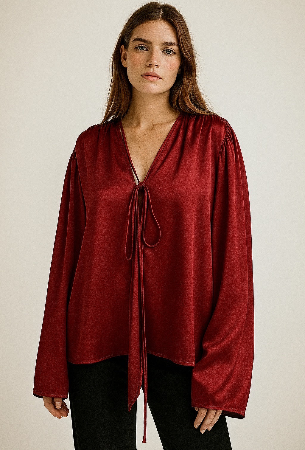Heerlijk zacht en prachtig om je outfit compleet te maken: deze prachtige silky blouse met strik moet je hebben! Shop hem in bordeaux.