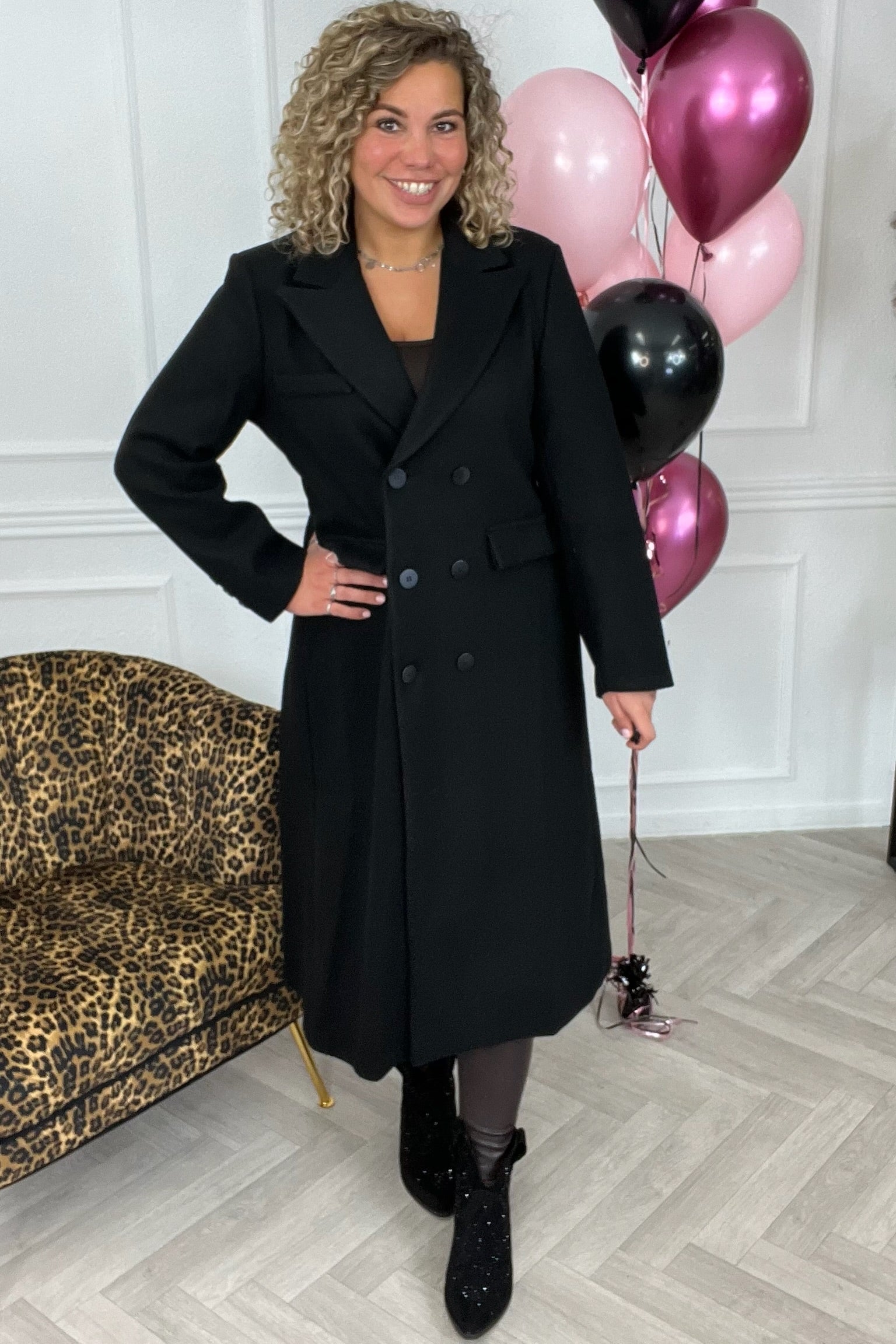 Een prachtige jas met mooie knopen voorop! Deze jas kan je aan de achterkant aantrekken met een soort riempje, waardoor die prachtig op maat en in de taille valt! Shop de back drawstring coat nu snel in black!