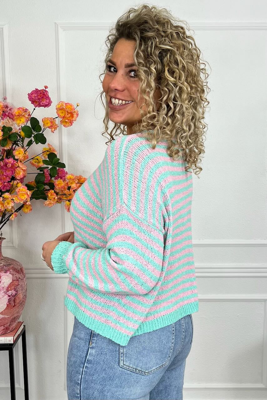 We love cotton! Shop deze fijne katoenen gestreepte trui vandaag in alle vrolijke kleurtjes, zoals turquoise/pink!