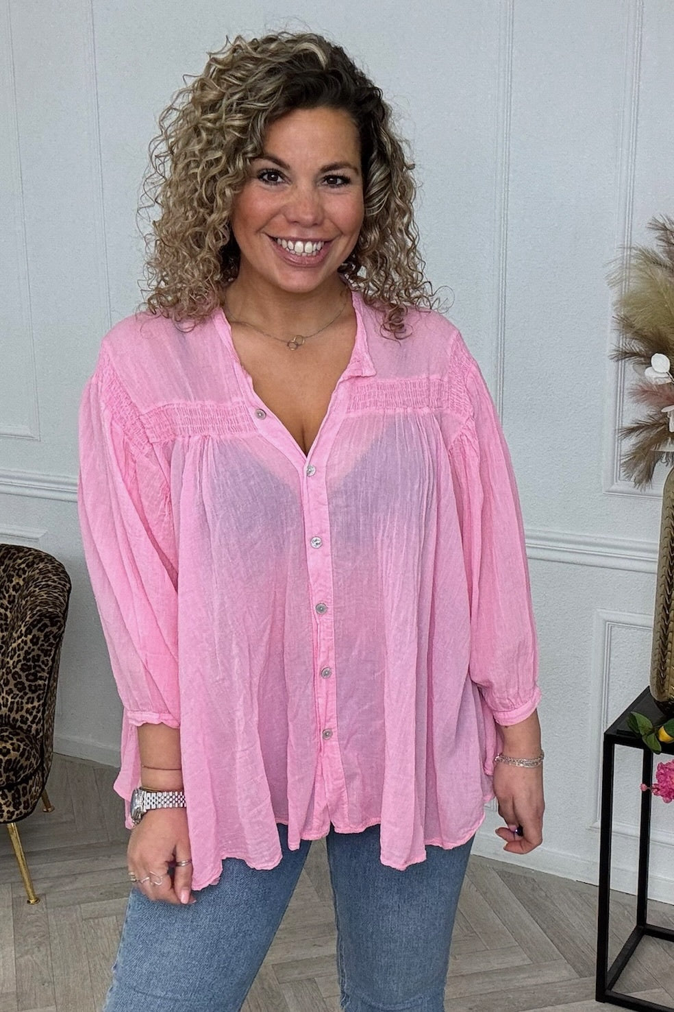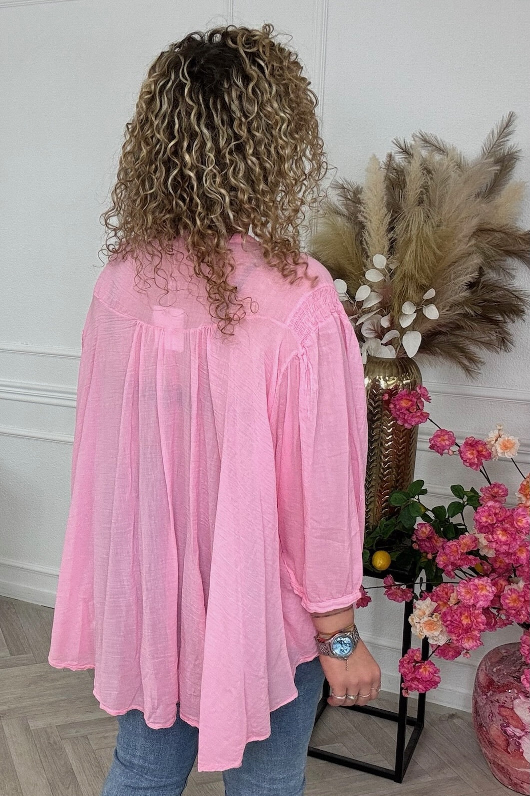 Deze prachtige katoenen blouse is lekker oversized, heeft mooie details, lange mouwen en knoop je open of dicht! Shop hem in pink!