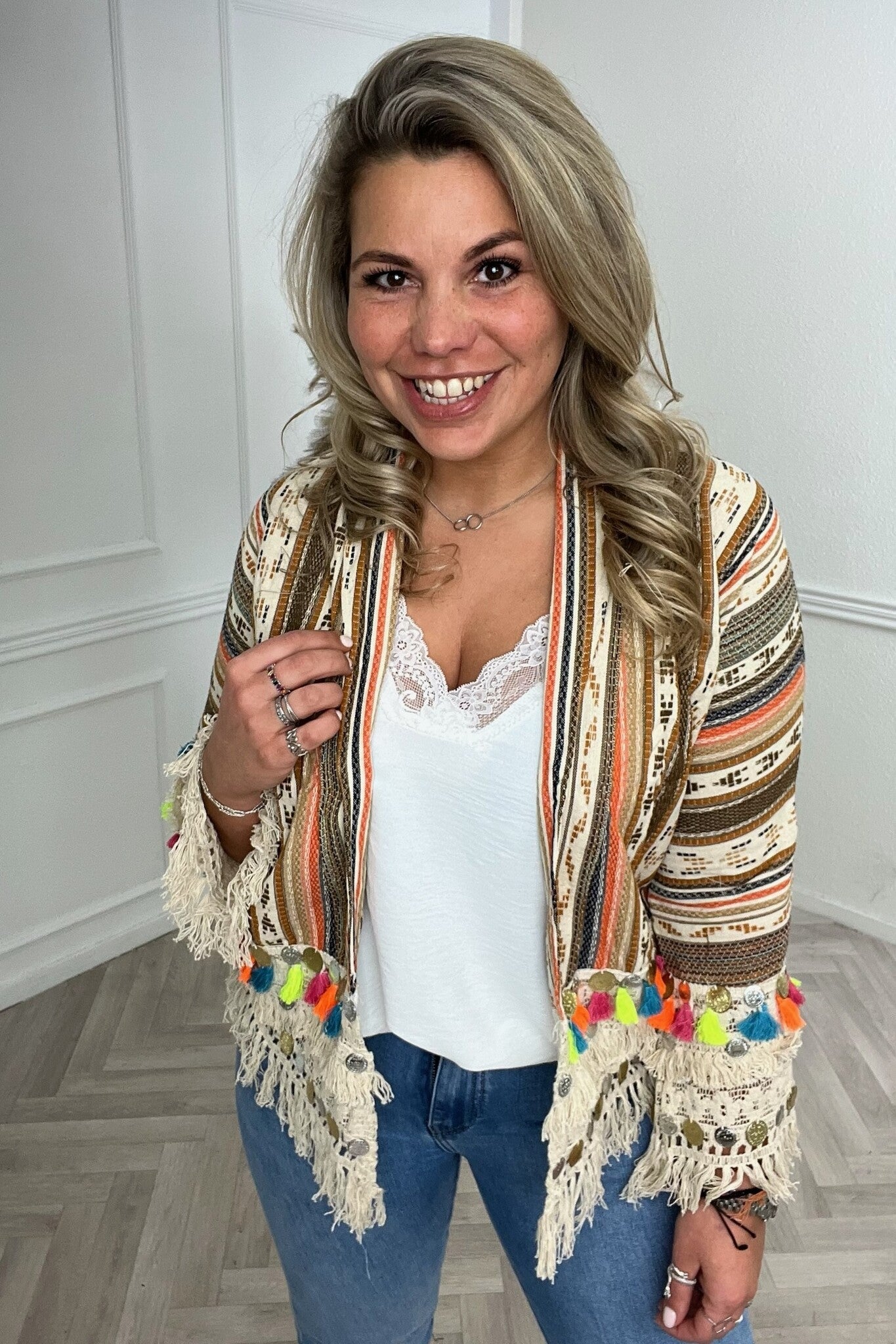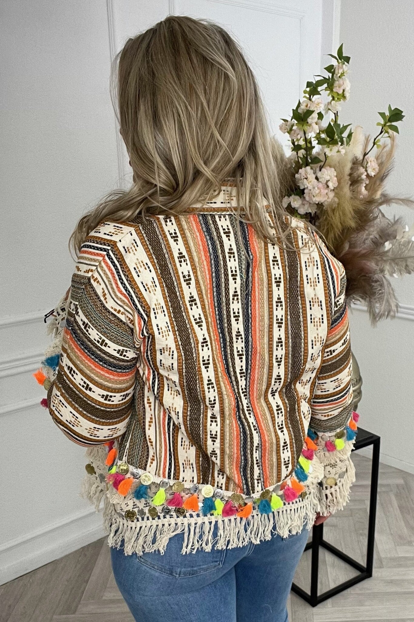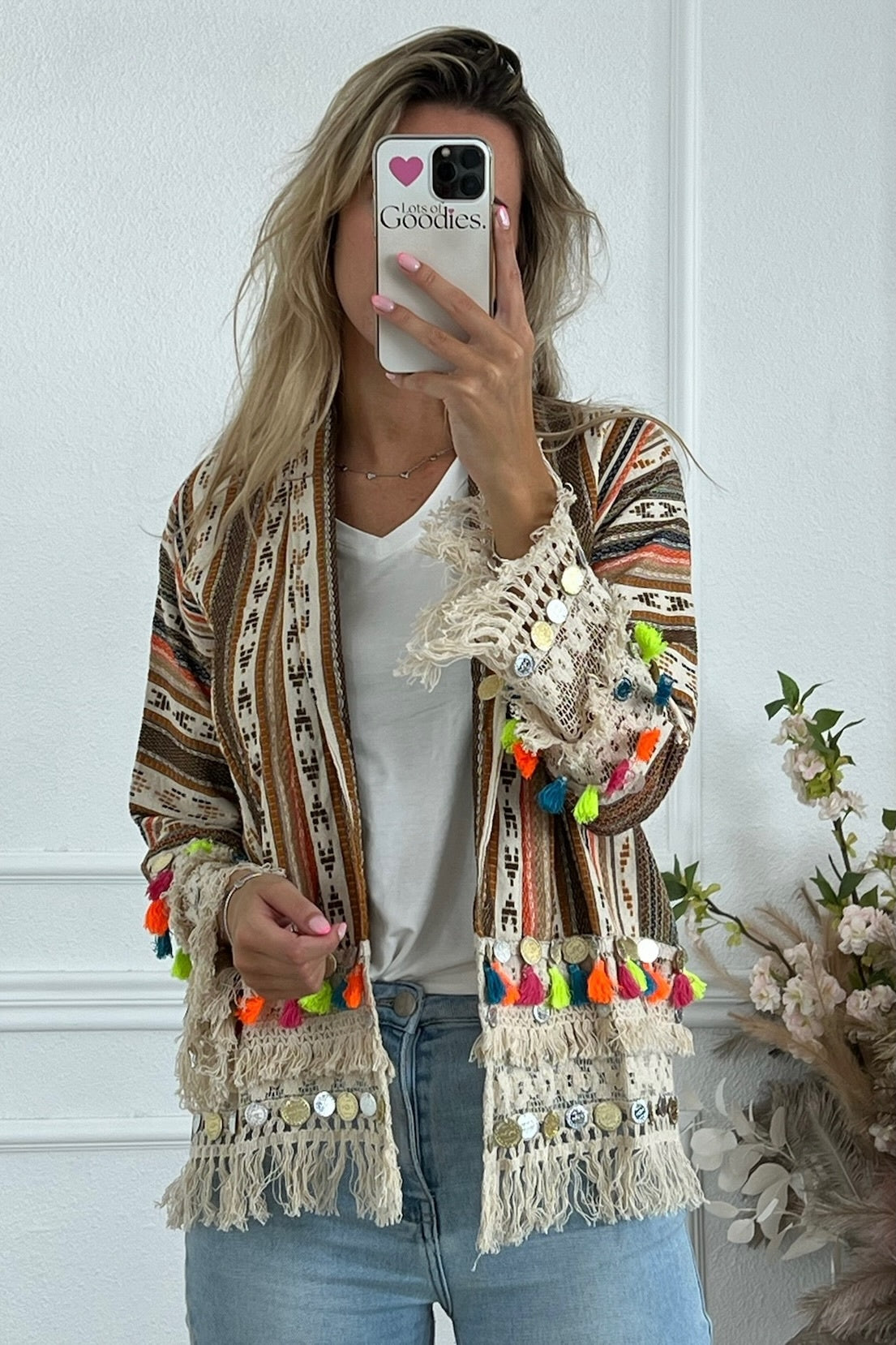 Een prachtig kleurrijk jasje met leuke muntjes en kwast details op de mouwen! Shop hem in cova santa!