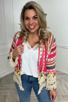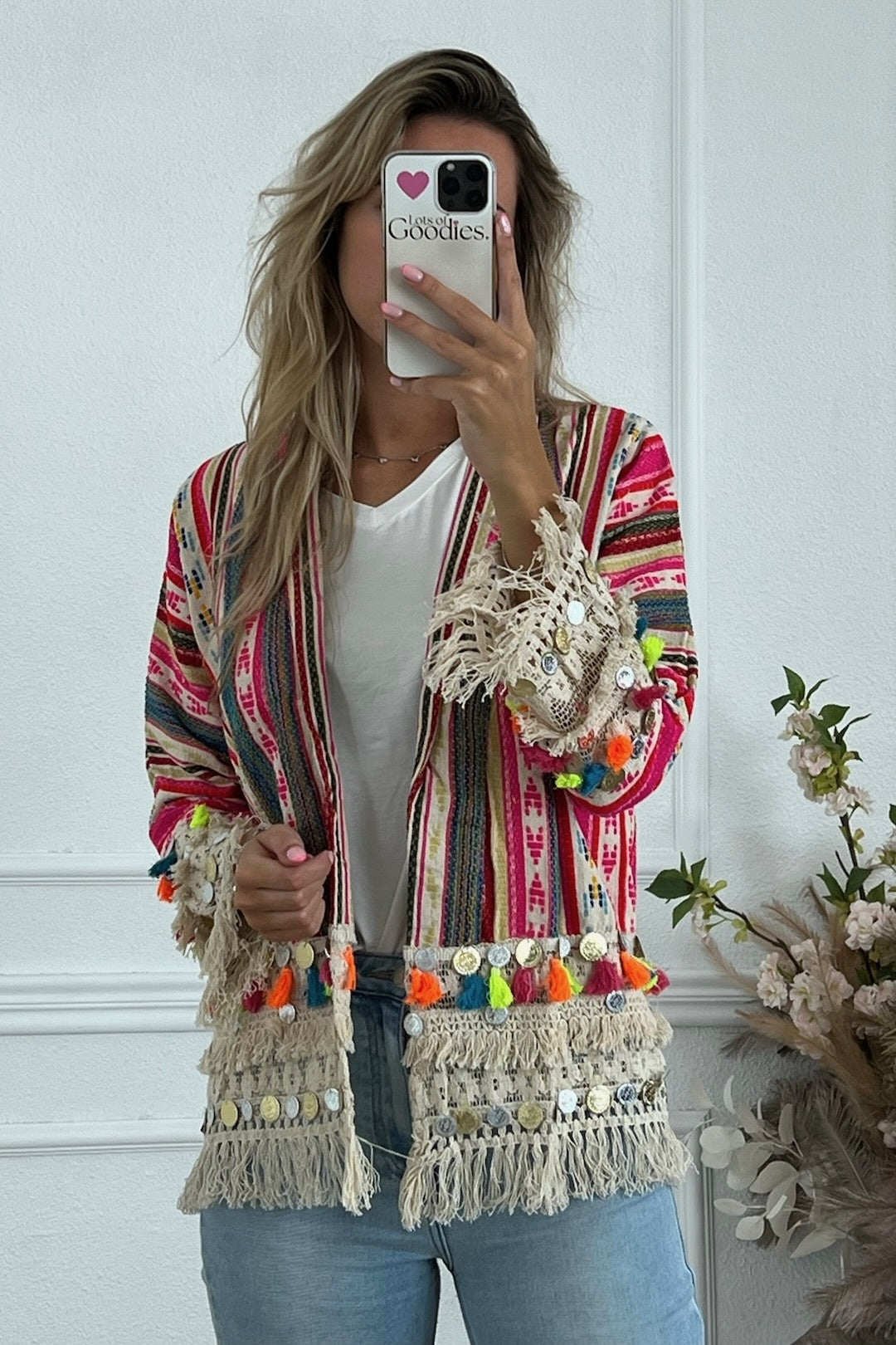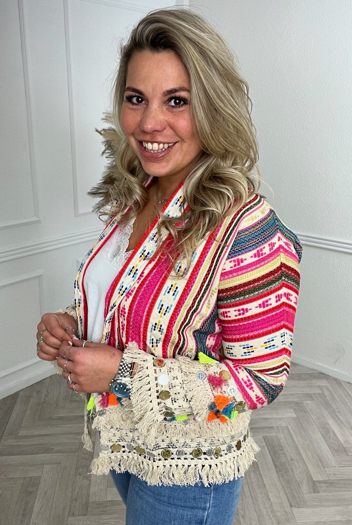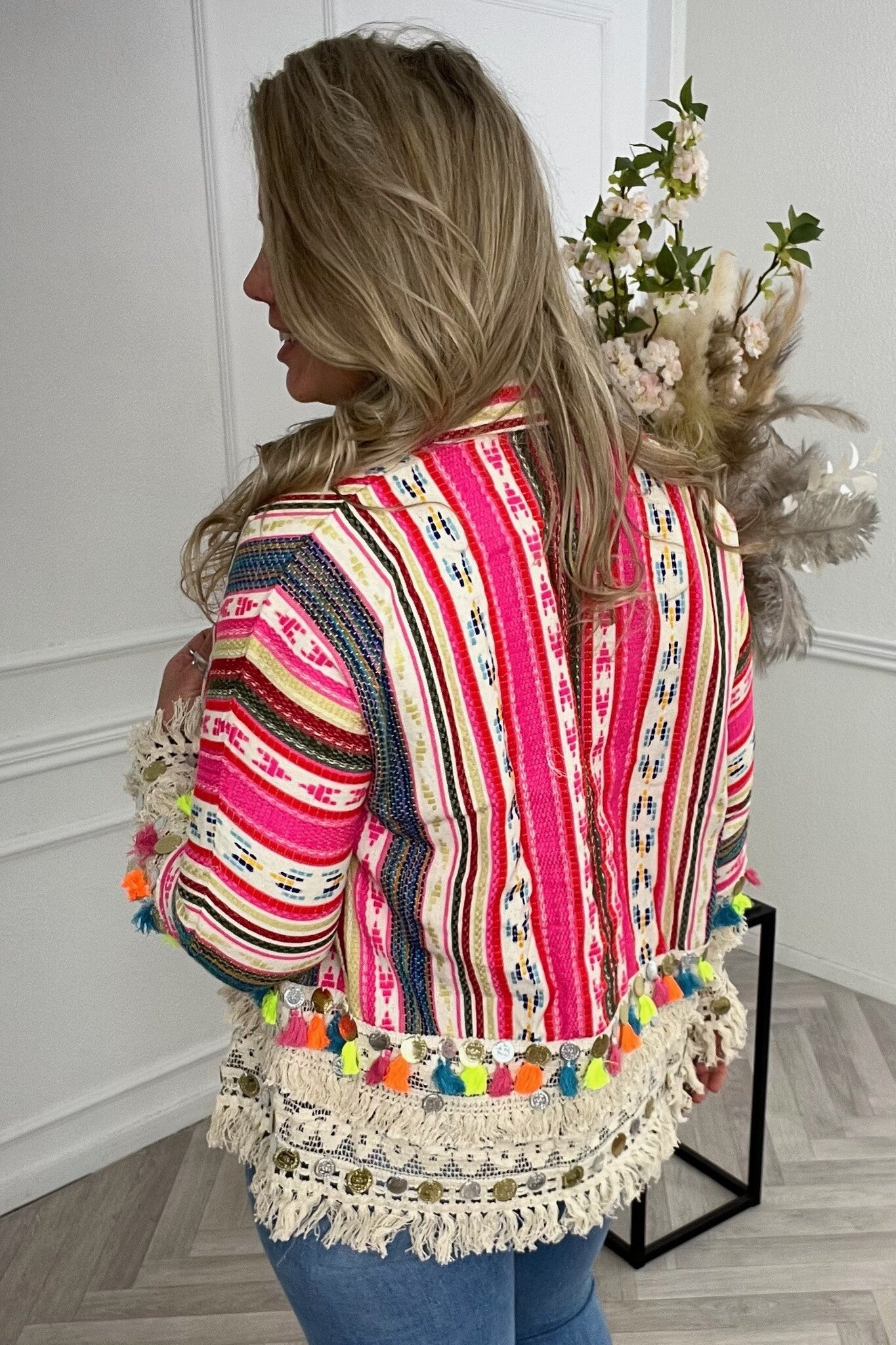 Een prachtig kleurrijk jasje met leuke muntjes en kwast details op de mouwen! Shop hem in saint jordi!