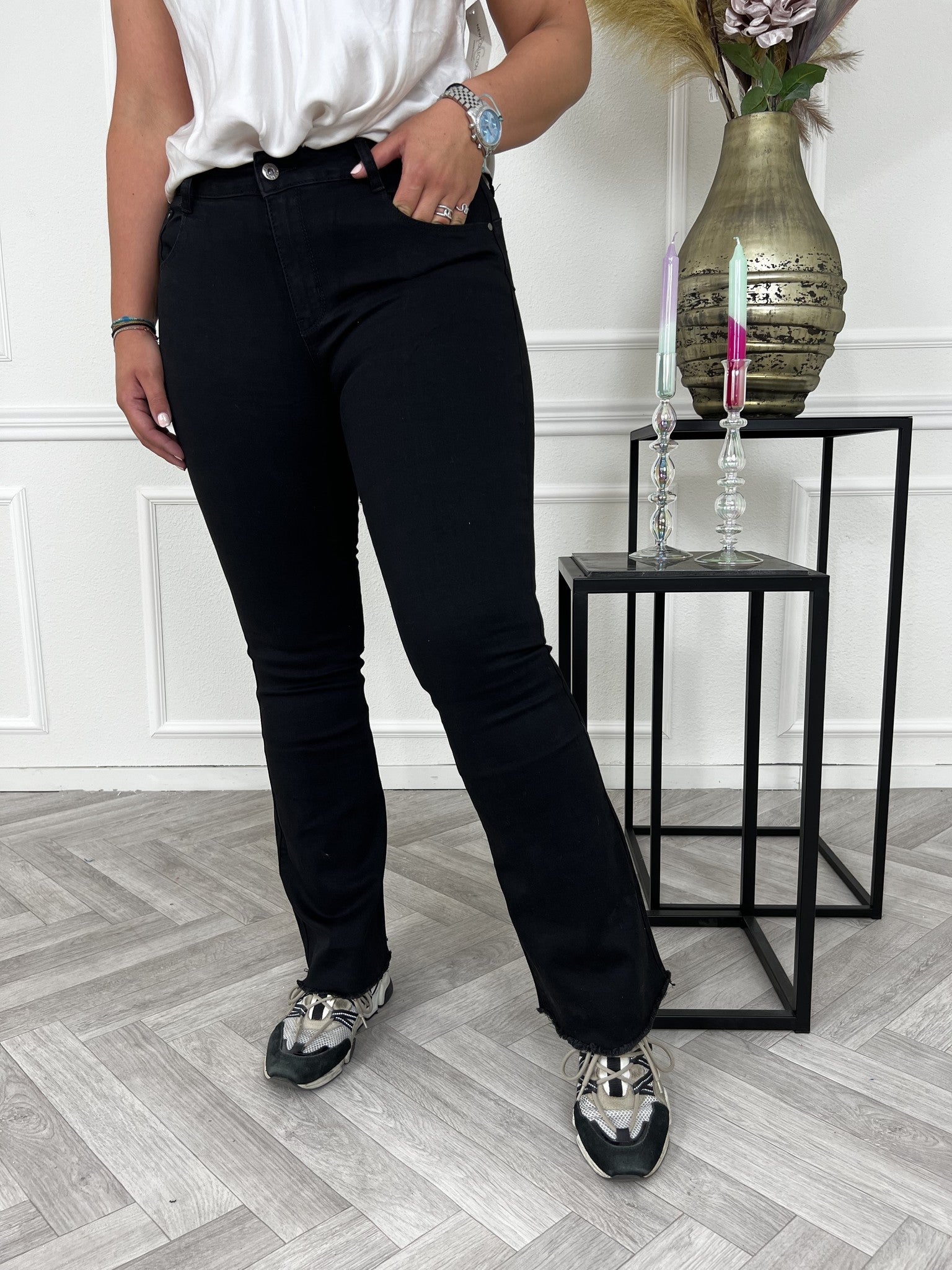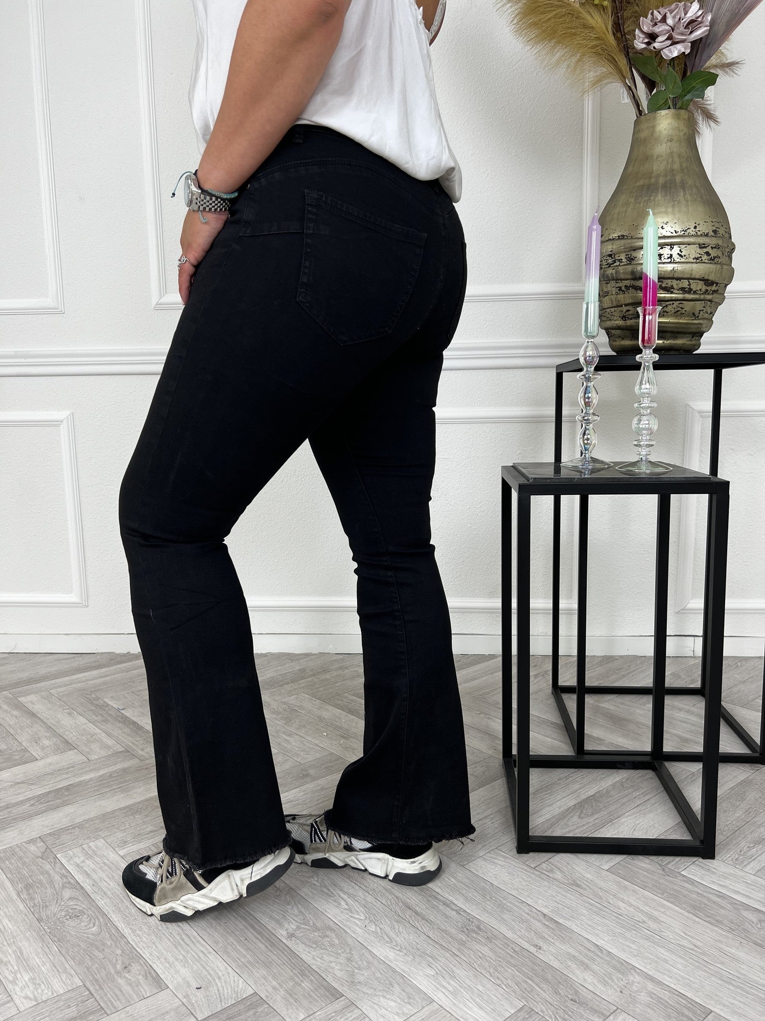 Een fijne Flared broek met stretch en een vormend effect bij de booty!