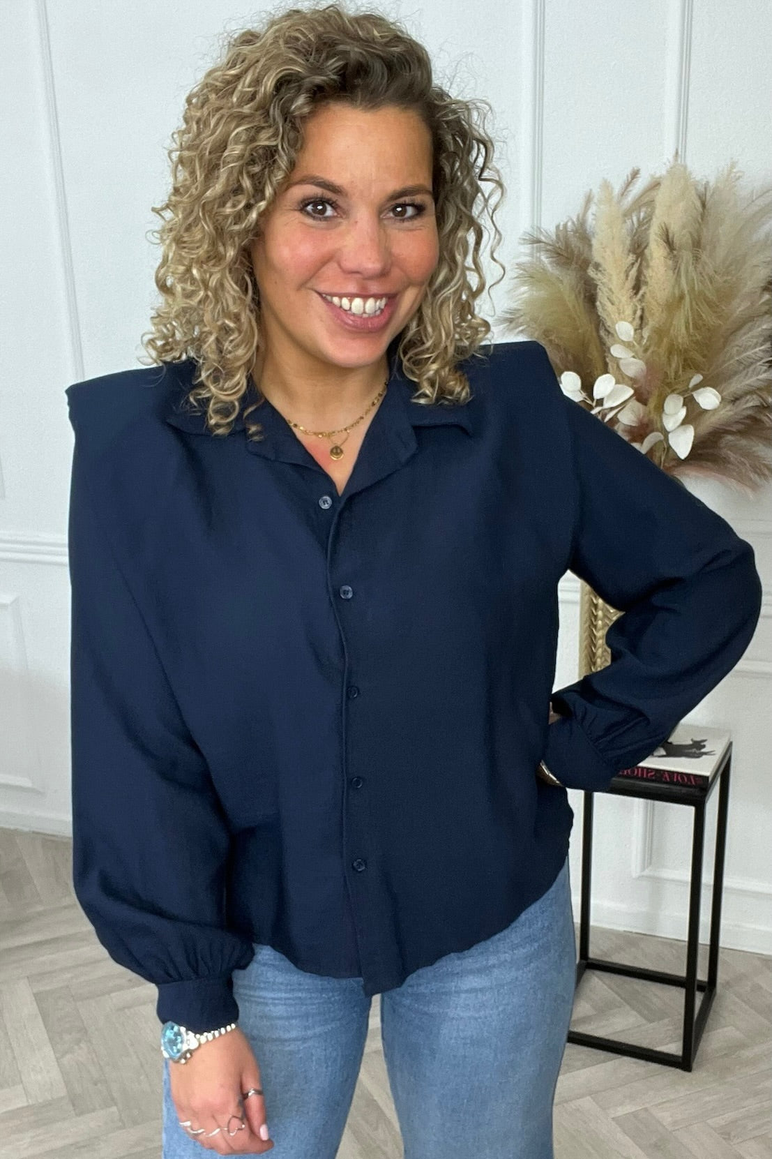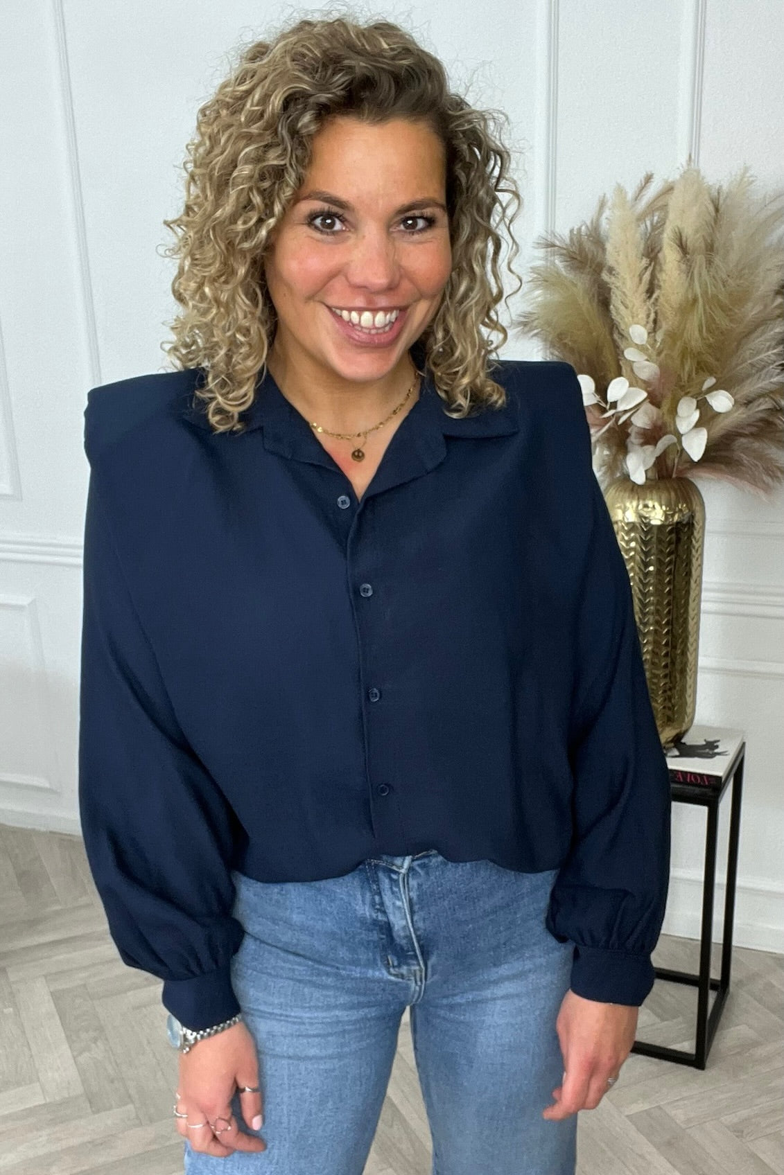 We hebben een prachtige nieuwe blouse met schoudervulling binnen! Shop de celeste shoulder blouse nu in navy!