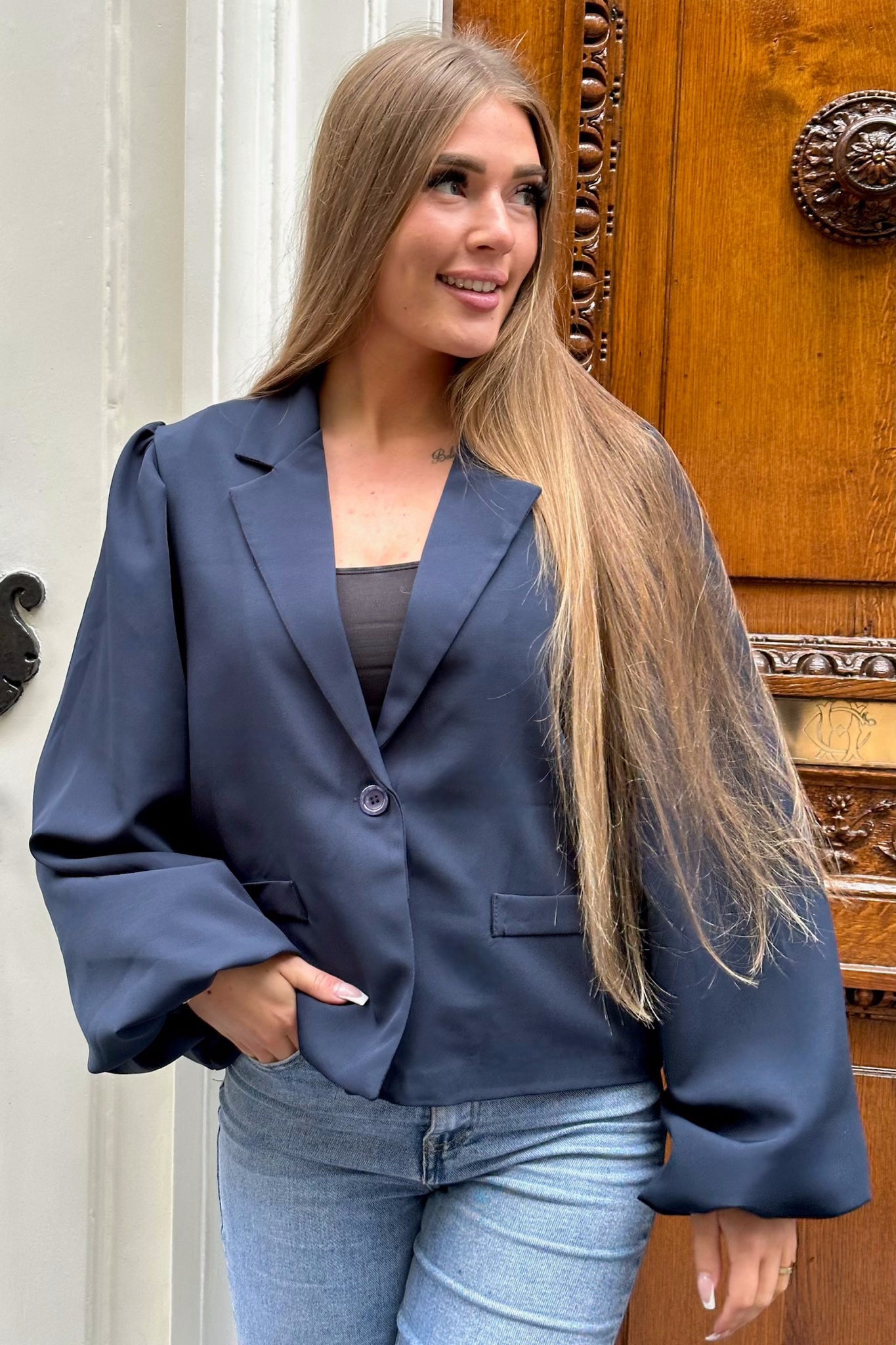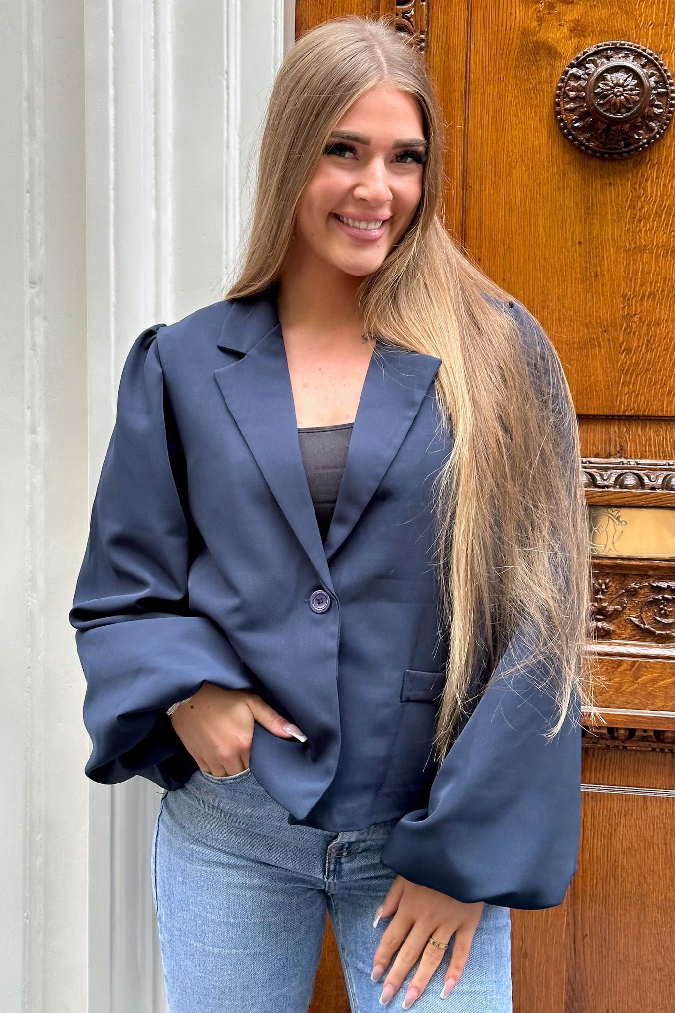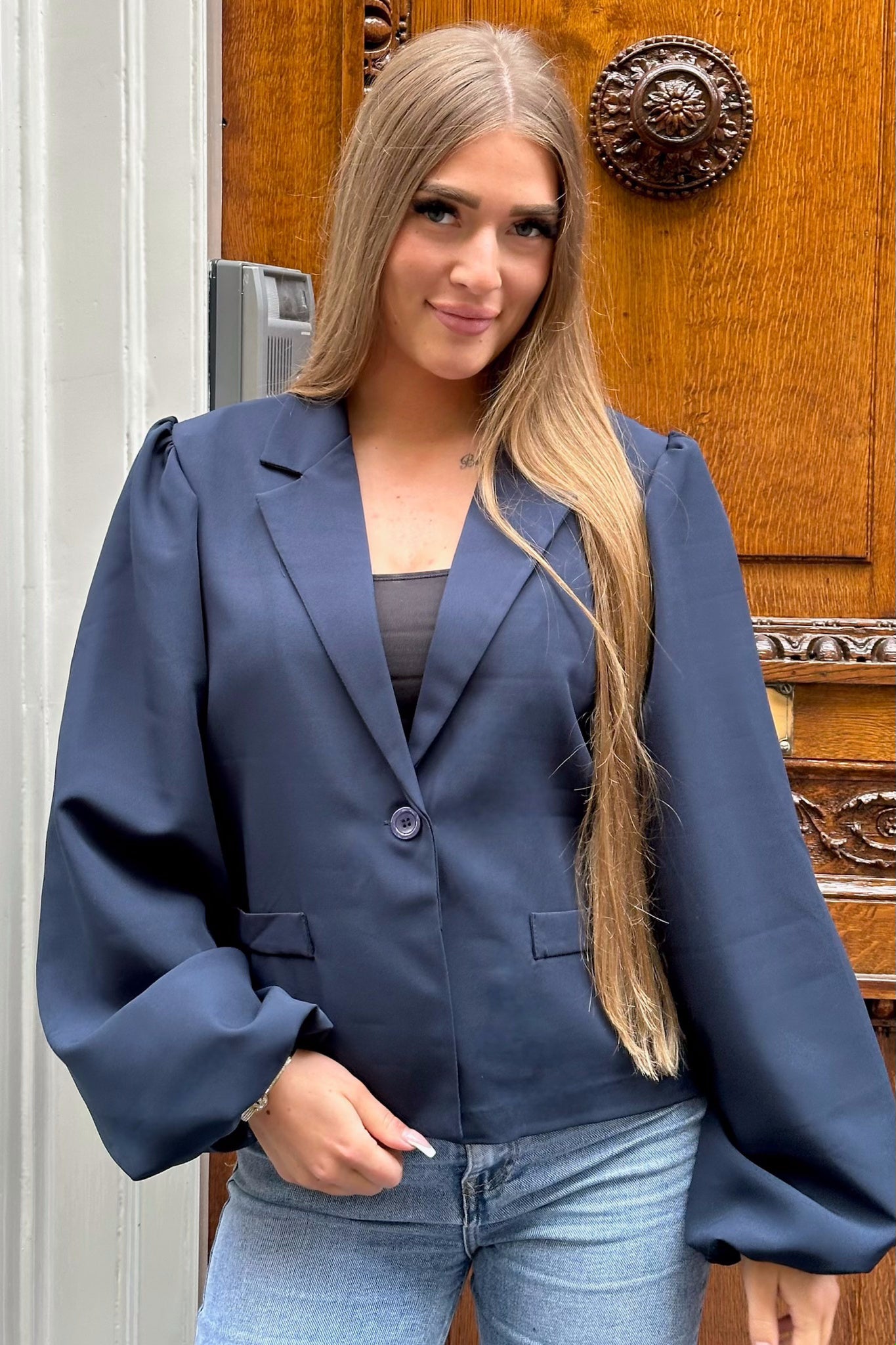 Onze geweldige nieuwe Claire blazers hebben imitatie zakken aan de voorkant en hele leuke poof mouwtjes. Shop hem nu in Navy!