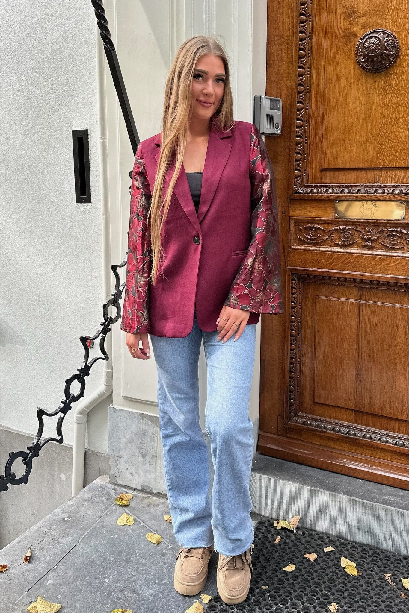 De classy long sleeve blazers hebben gedetailleerde mouwen met een prachtige bloemen patroon. De blazer heeft imitatie zakken aan de voorkant en een mooie fit. Shop hem in Red!