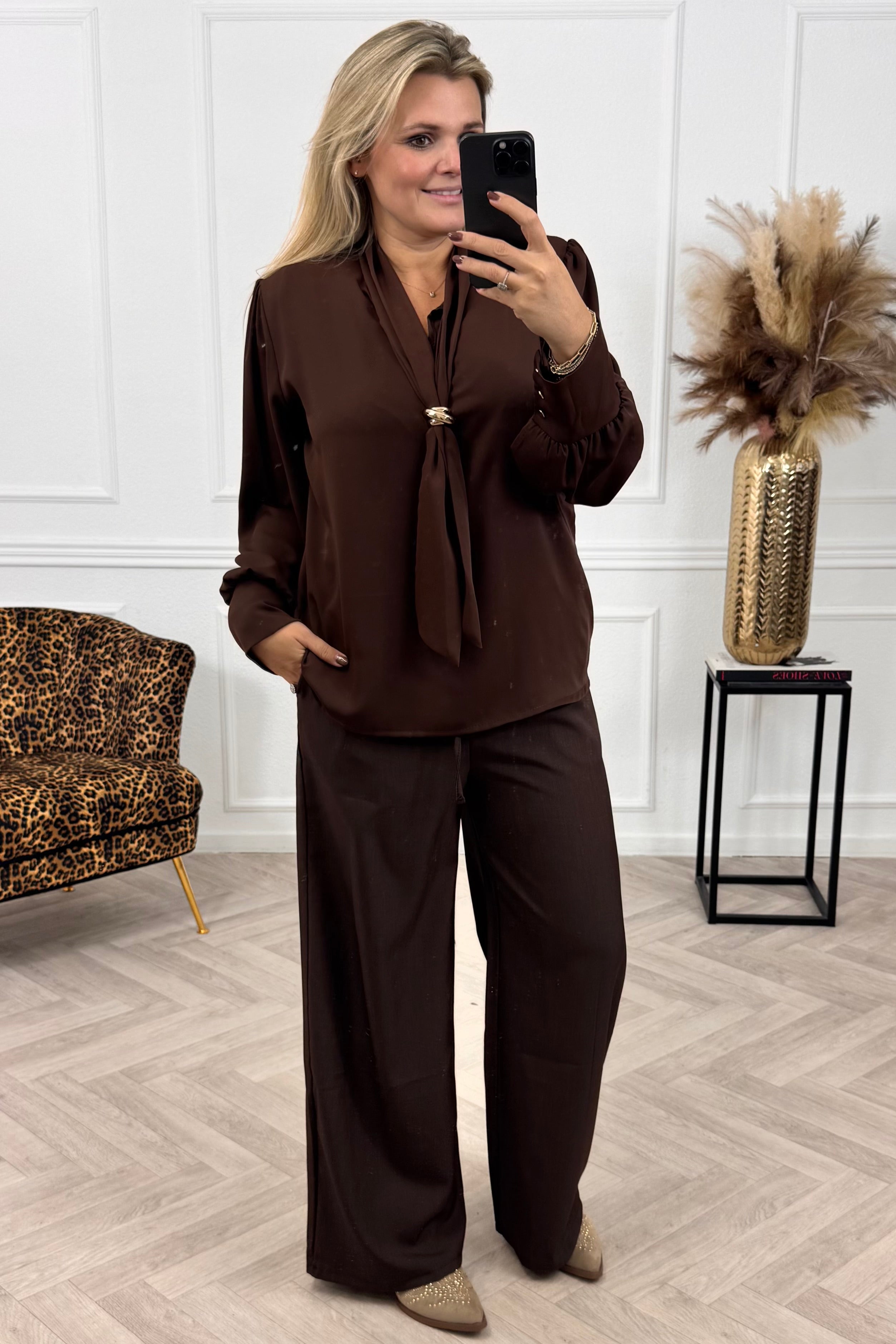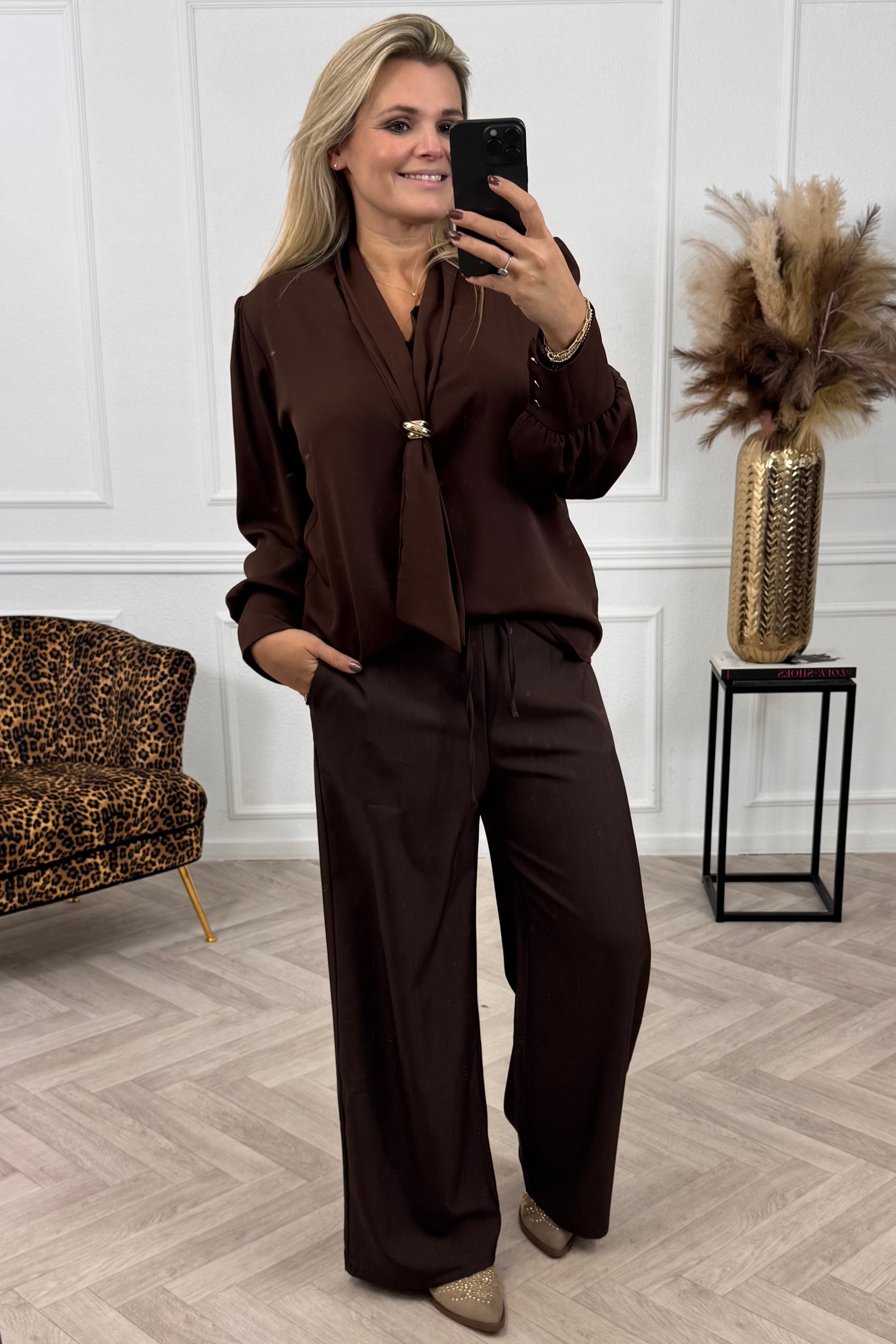 Om jouw classy set compleet te maken shop je deze satin blouse nu in bijpassende kleuren! Wat een plaatje: door de gouden knopen en strik om de hals heeft deze blouse een mooie classy uitstraling! Shop hem in brown!