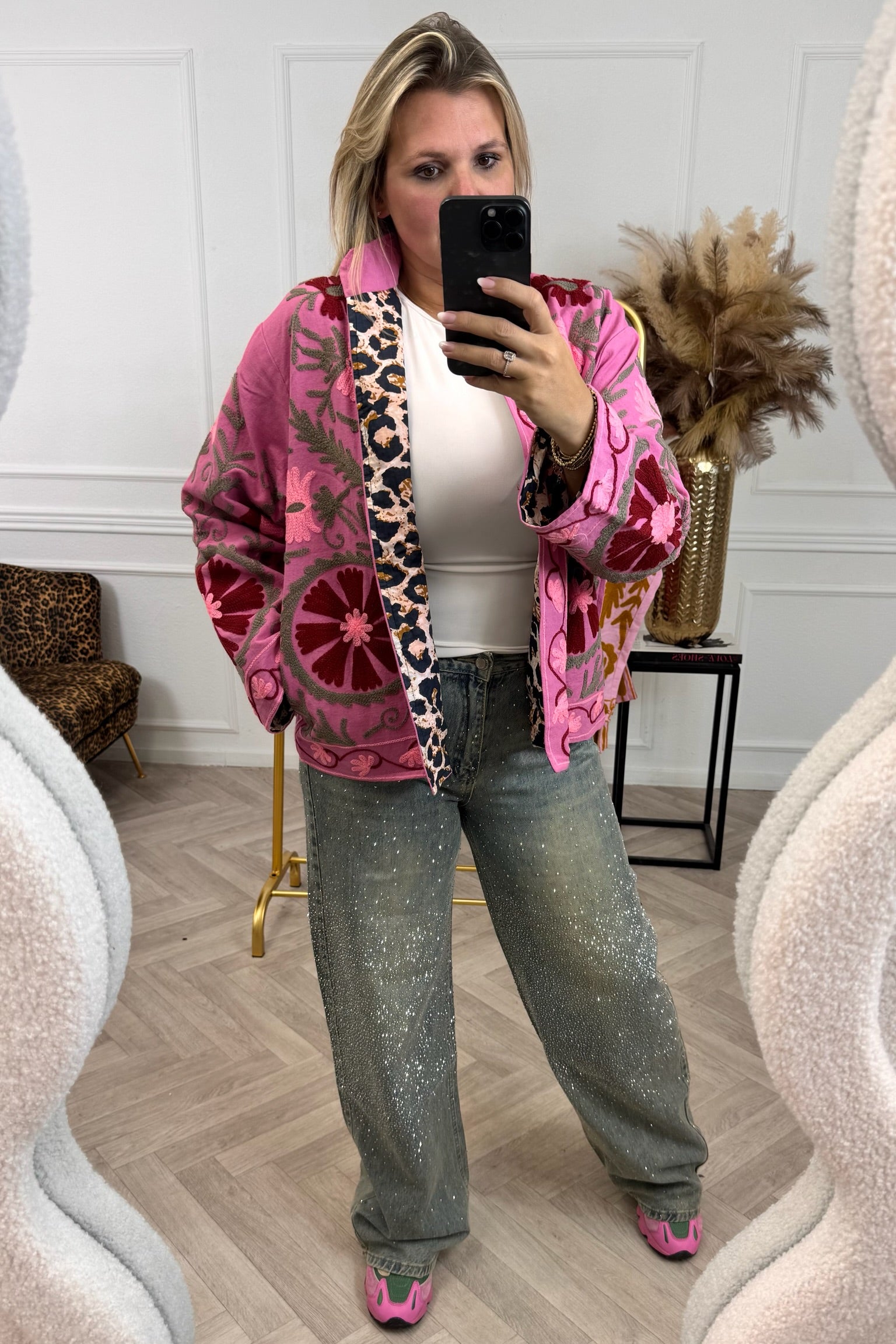 Wauw! Dit fantastische jasje is gemaakt van 100% katoen en valt lekker oversized. Hij heeft een leuke geborduurde print, shop hem nu in pink!