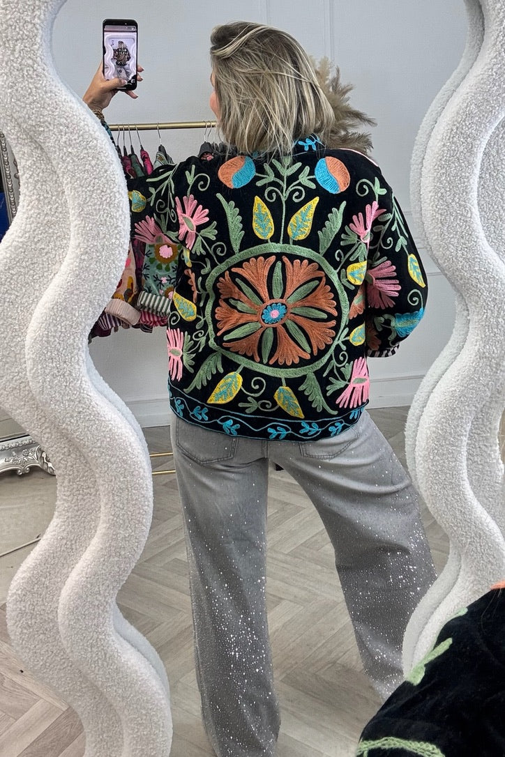 Dit mega leuke jasje is gemaakt van 100% katoen en heeft een velvet look! Dit exemplaar heeft een gave flower leaves print, hij is ook verkrijgbaar met andere mooie prints. Wees er snel bij en shop the flower leaves jacket nu in het black!