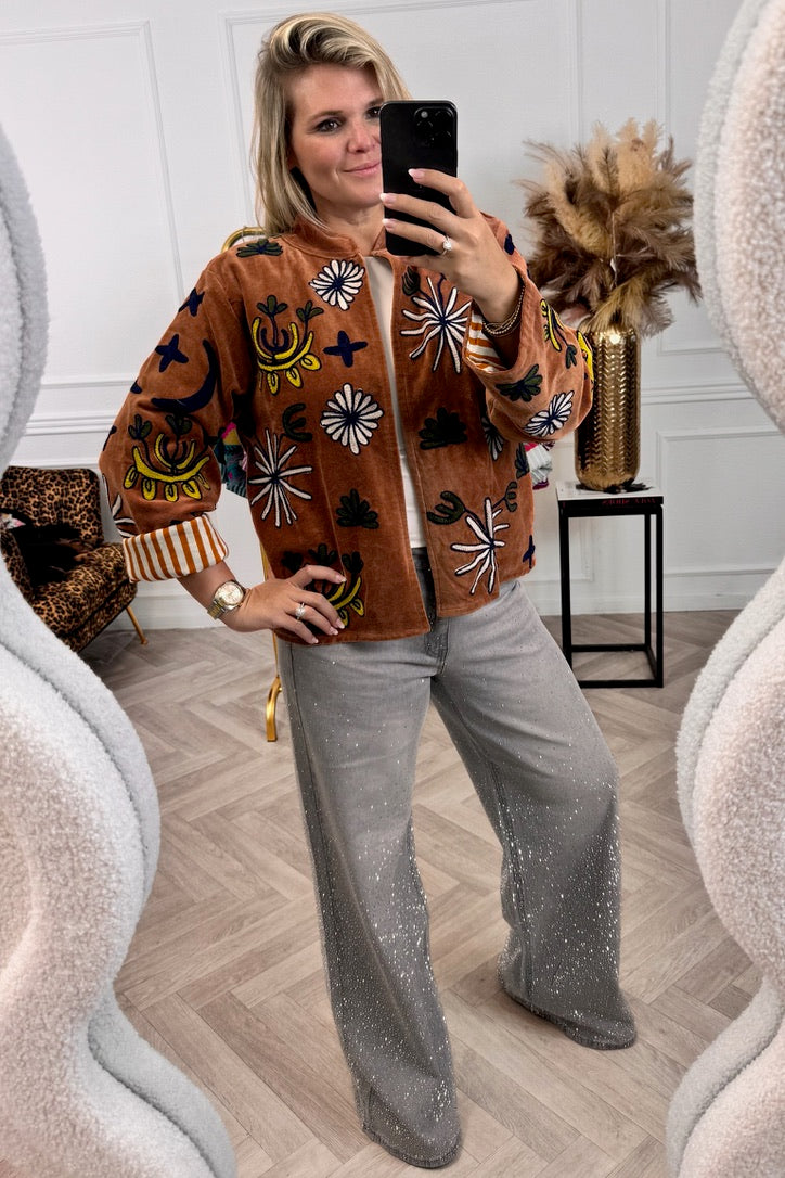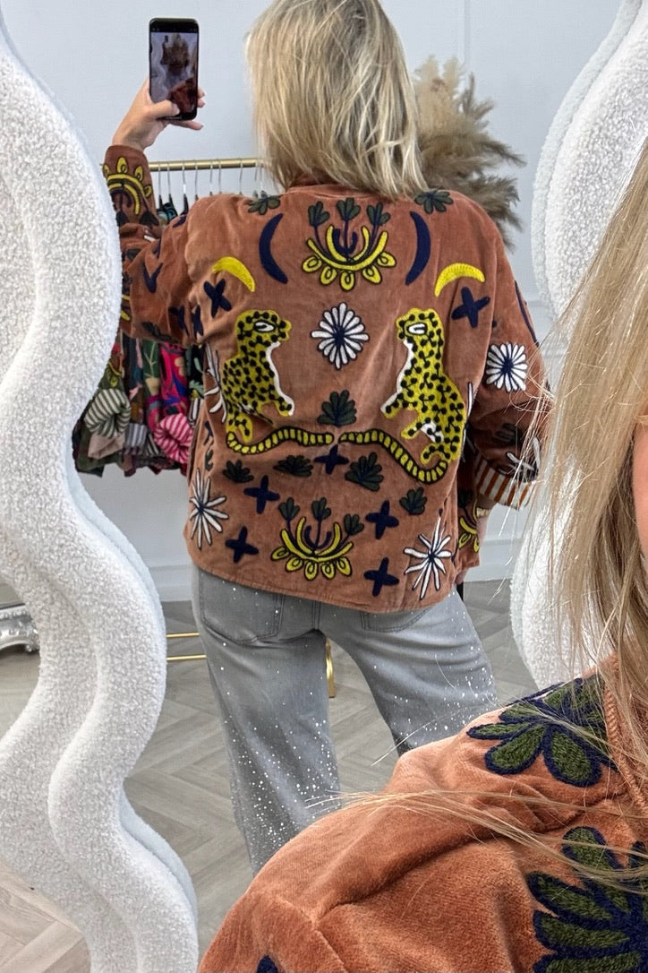 Dit mega leuke jasje is gemaakt van 100% katoen en heeft een velvet look! Dit exemplaar heeft een gave leopard print, hij is ook verkrijgbaar met andere mooie prints. Wees er snel bij en shop the leopard jacket nu in het brown!