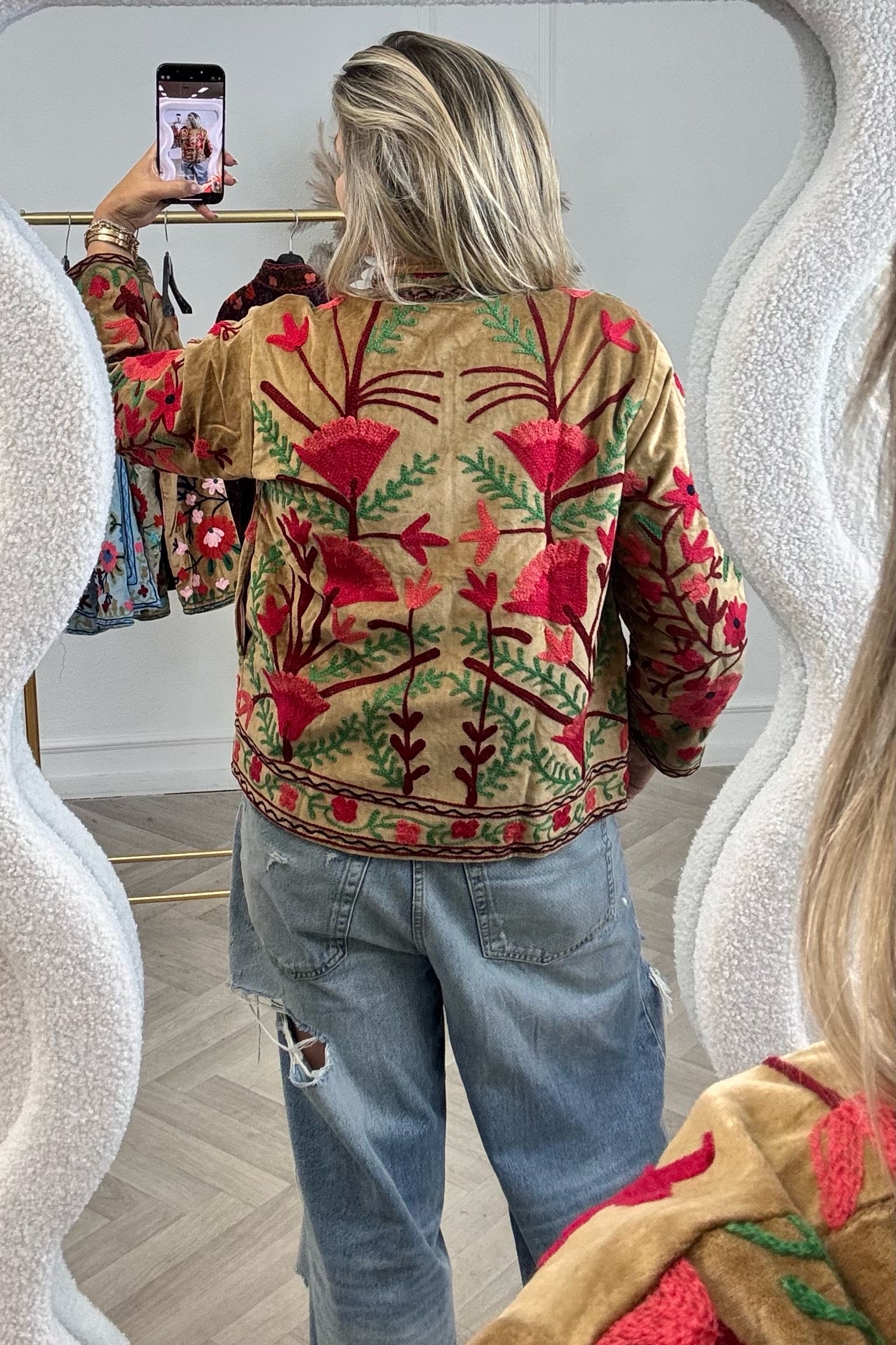 Dit mega leuke jasje is gemaakt van 100% katoen en heeft een velvet look! Dit exemplaar heeft een mooie lily print. Shop hem nu in camel/red!