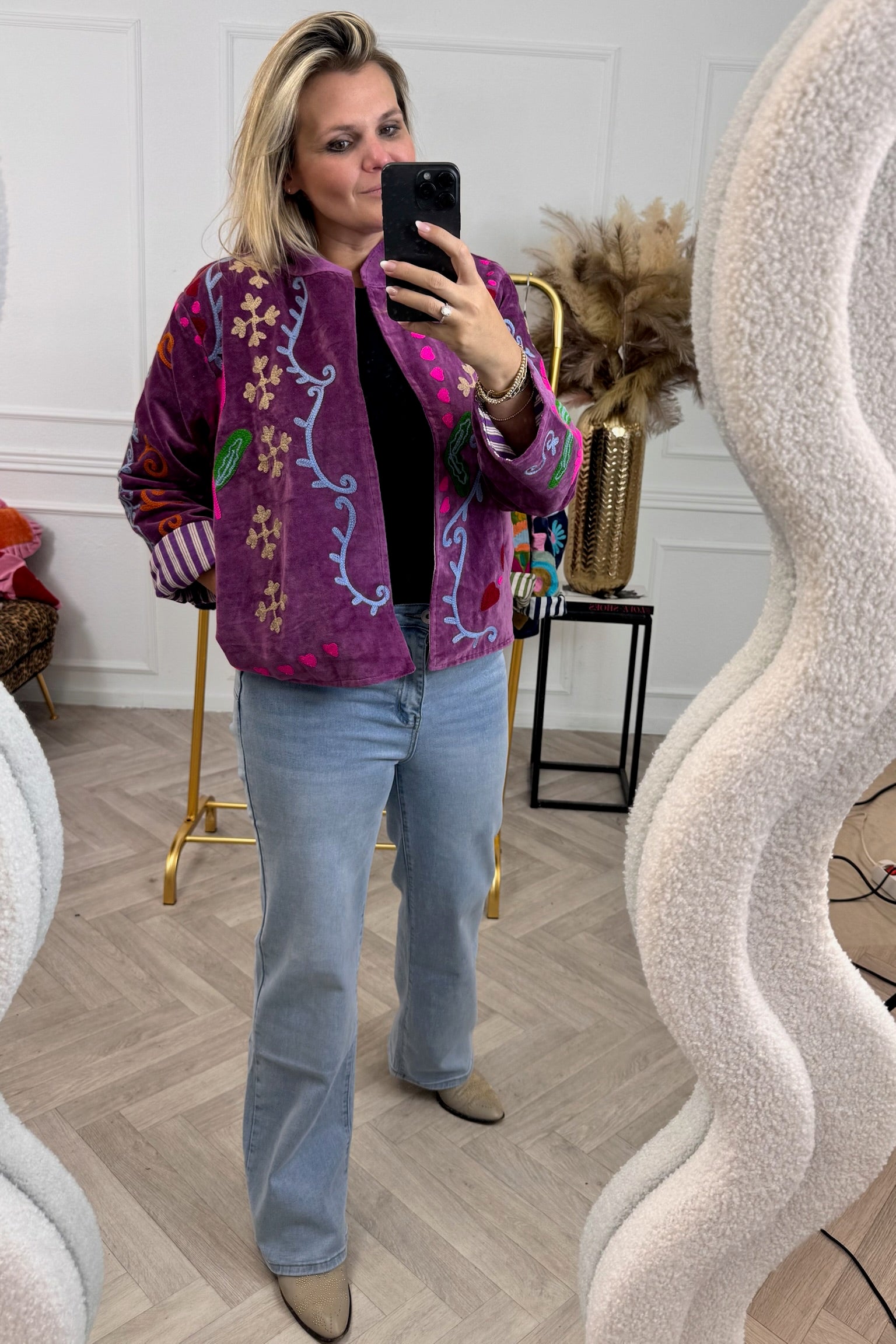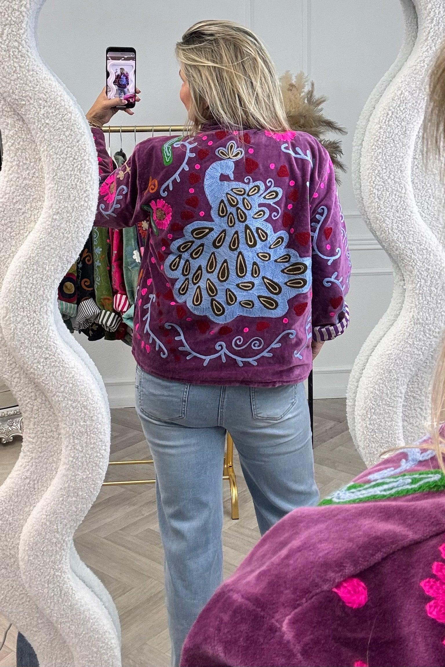 Dit mega leuke jasje is gemaakt van 100% katoen en heeft een velvet look! Dit exemplaar heeft een gave peacock print, hij is ook verkrijgbaar met andere mooie prints. Wees er snel bij en shop hem nu in peacock print in het purple!