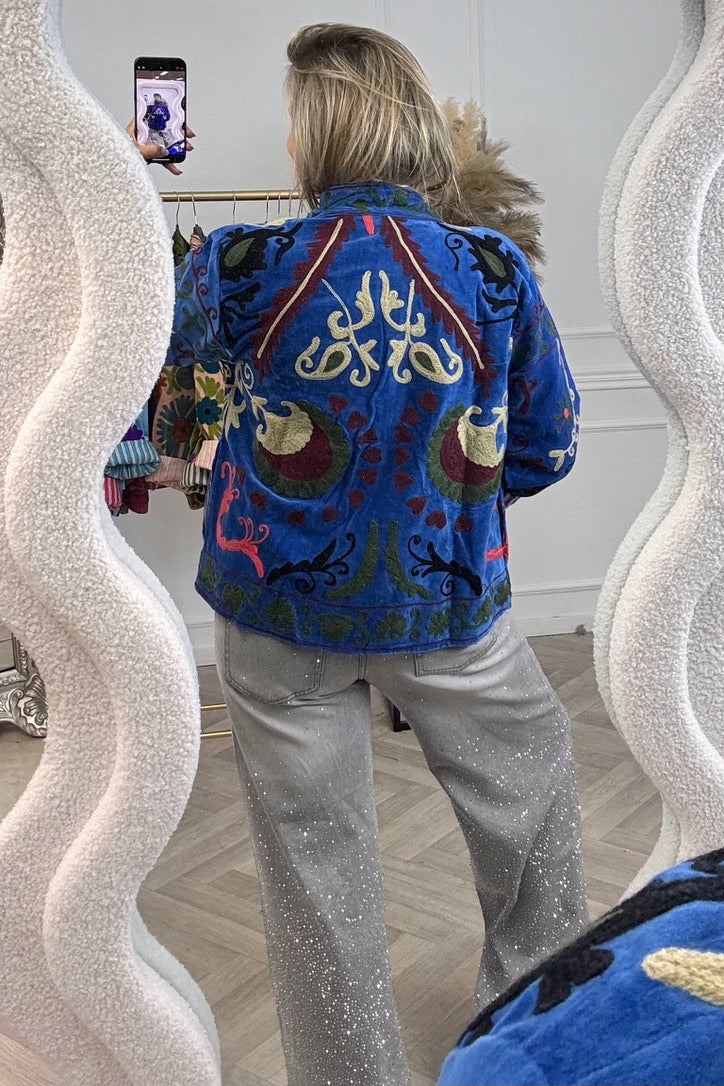 Dit mega leuke jasje is gemaakt van 100% katoen en heeft een velvet look! Dit exemplaar heeft een gave swirl print, hij is ook verkrijgbaar met andere mooie prints. Wees er snel bij en shop the swirl jacket nu in het blue!