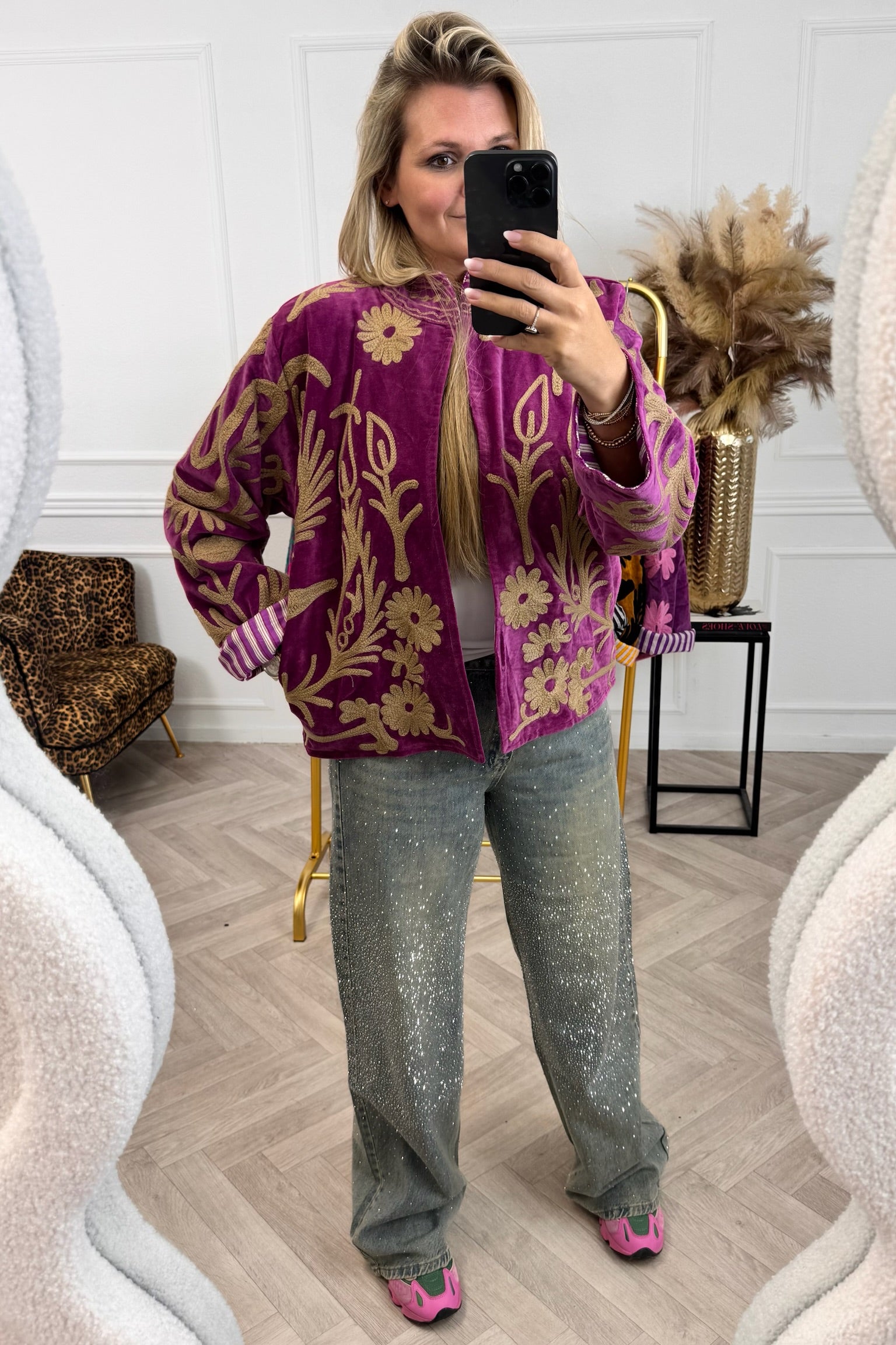 Dit mega leuke jasje is gemaakt van 100% katoen en heeft een velvet look! Dit exemplaar heeft een gave trishul print, hij is ook verkrijgbaar met andere mooie prints. Wees er snel bij en shop hem nu in magenta trishul print!
