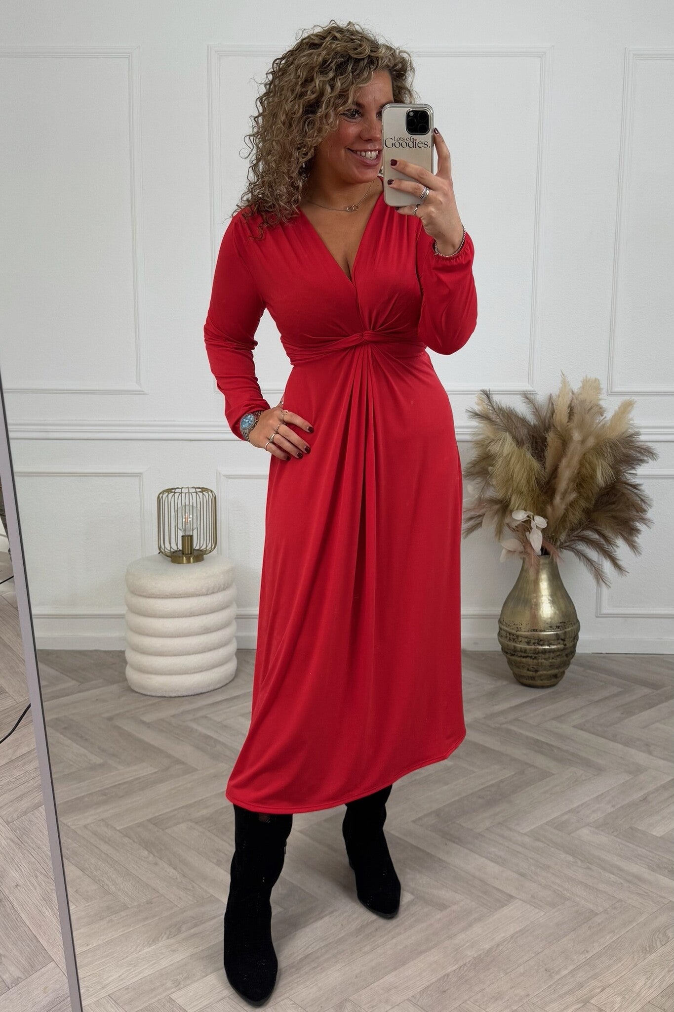 Onze bestseller is weer terug! Deze fijne maxi jurk heeft een knoop aan de voorkant en twee linten om achter vast te binden, nu in prachtige herstkleuren! Shop hem in bright red!