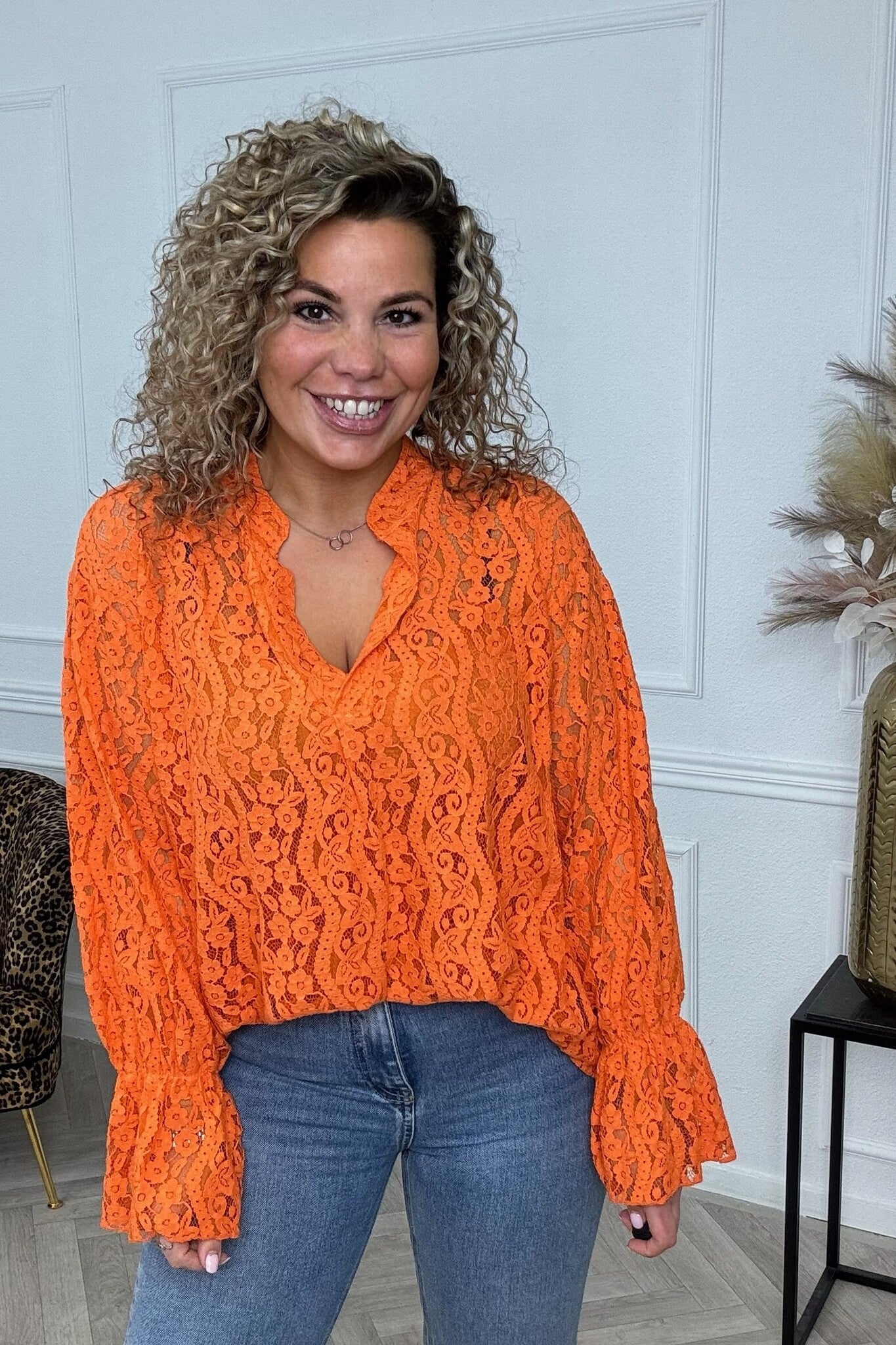 Deze lace blouse heeft lange mouwen en een bijpassend hemdje in dezelfde kleur. Shop hem in orange!