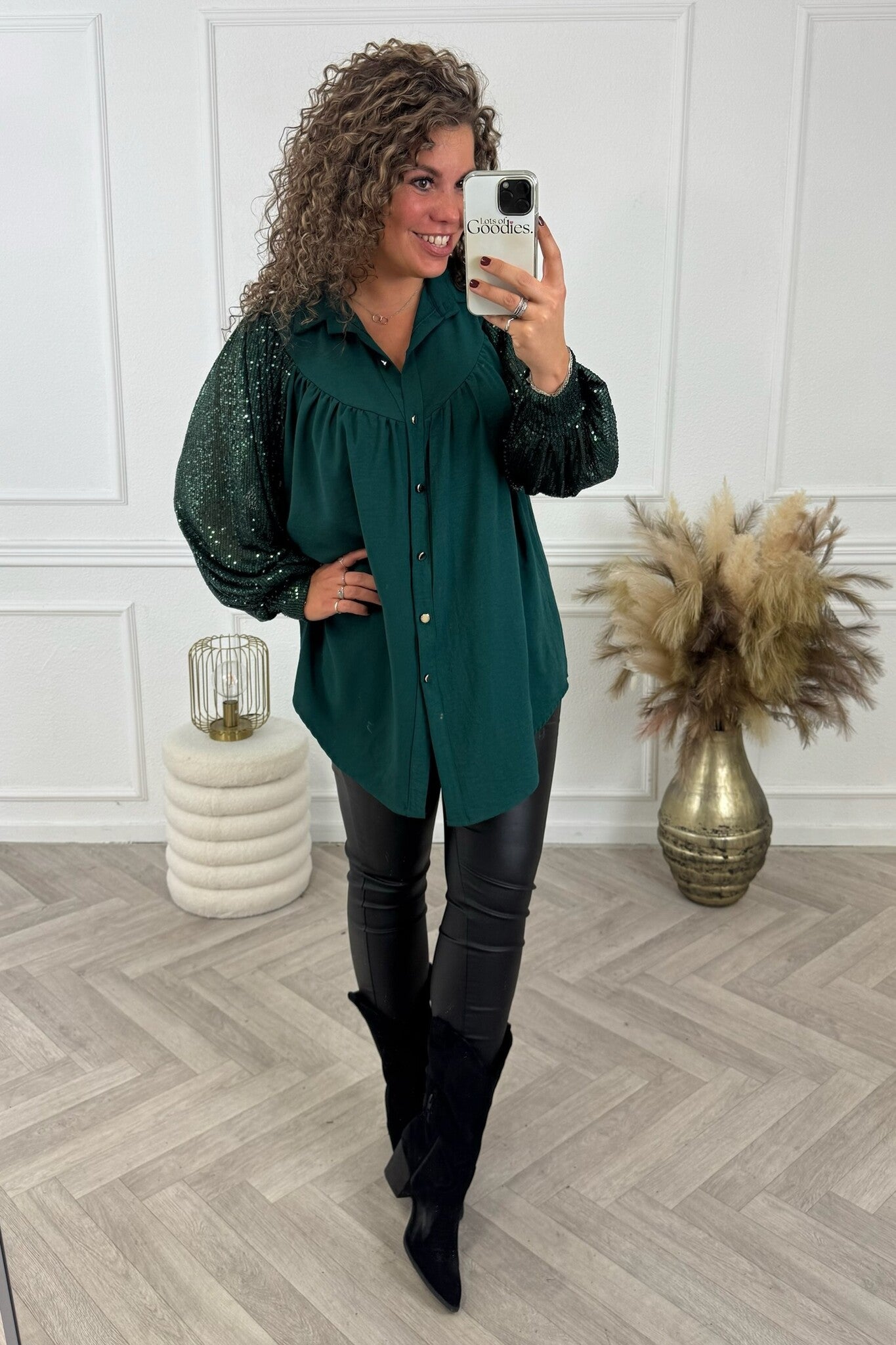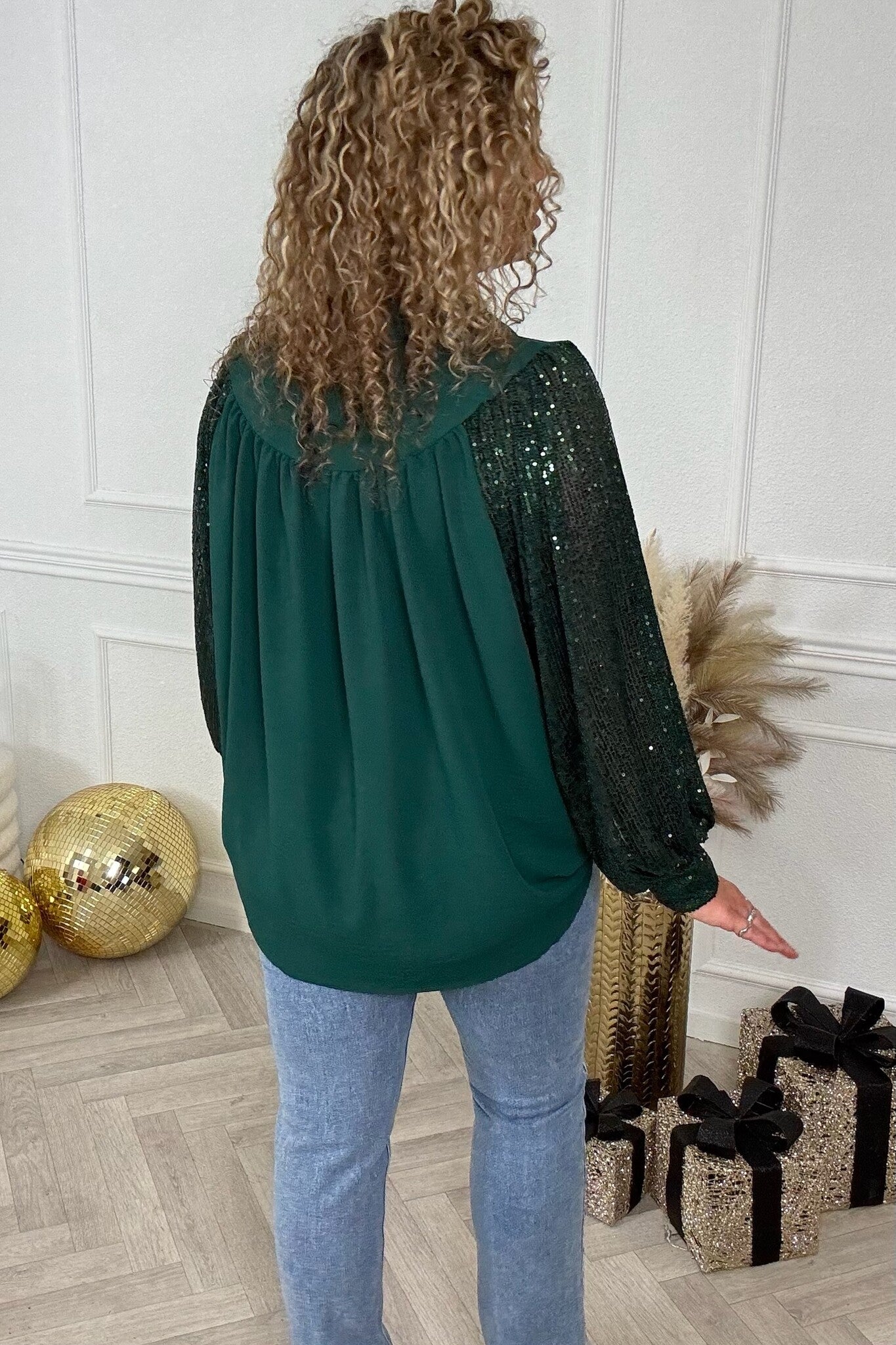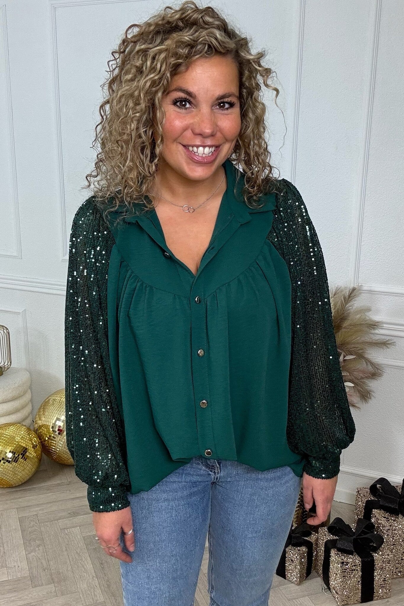 Curvy Sequin Sleeves Blouse - Bottle Green