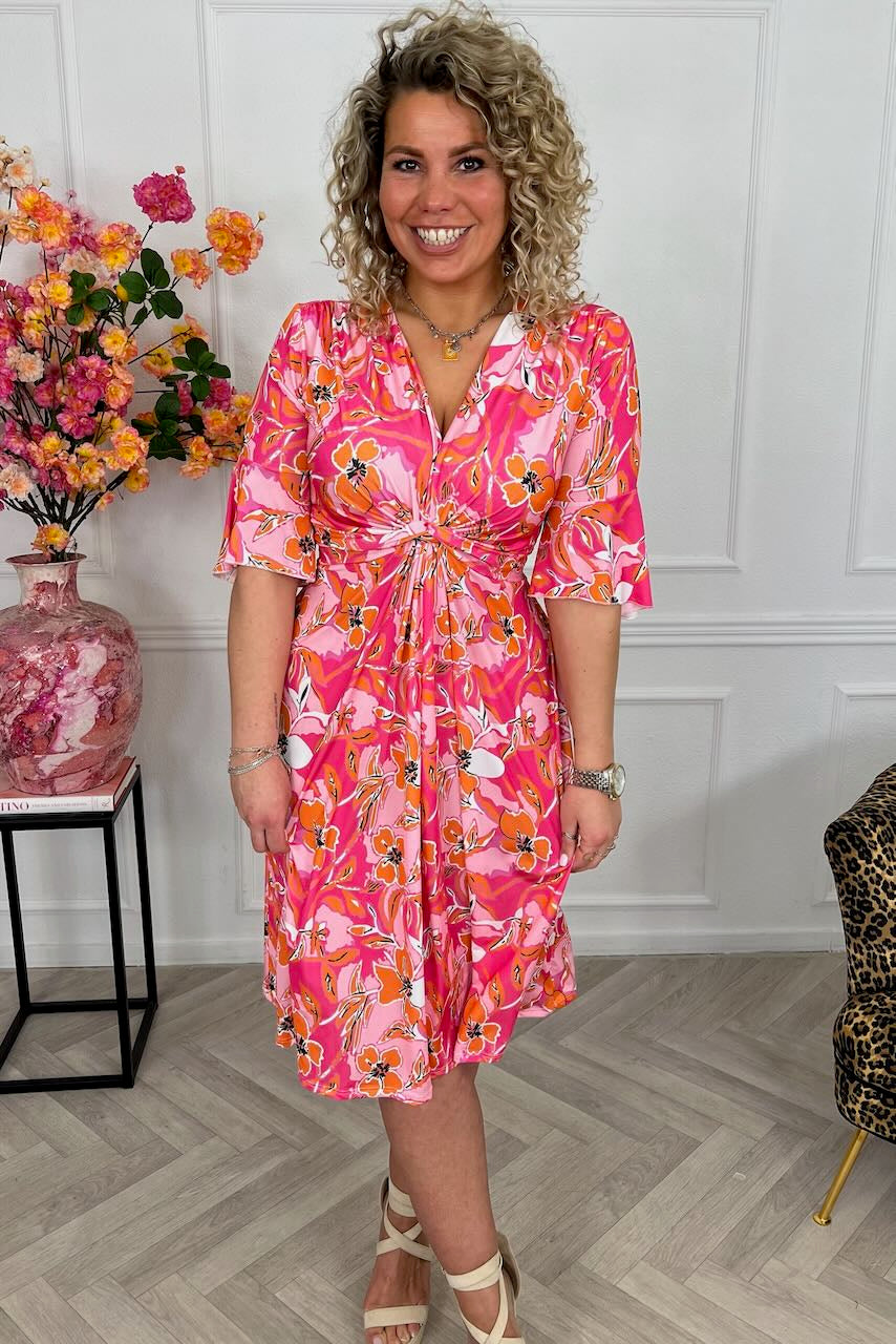 Onze signature dress is terug! Shop onze short knotted dress online in nieuwe prints! Shop hem in onze celesteprint in pink/fuchsia!