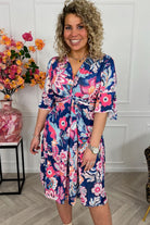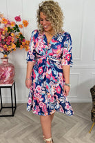 Curvy Short Knotted Flora Dress - Kobalt/Pink