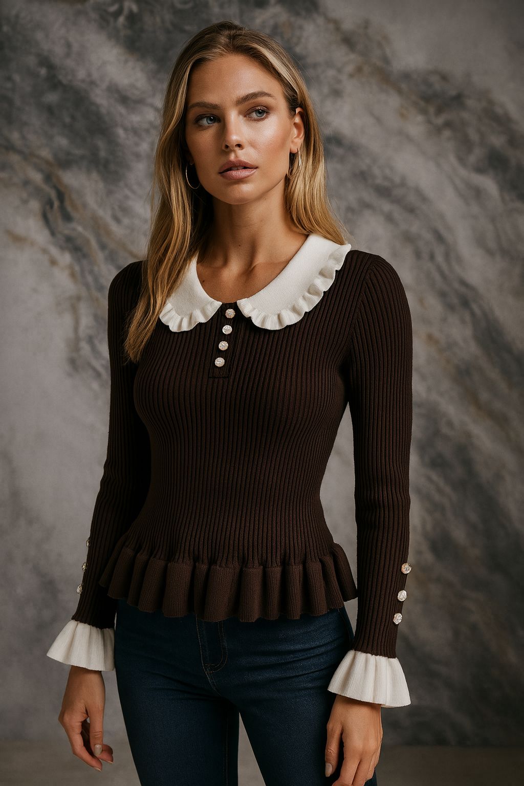 Deze nieuwe gave tops zijn binnen en hebben een heel leuk flair mouwtje en een te gekke kraag! Shop de emely collar peplum top in dark brown nu snel!