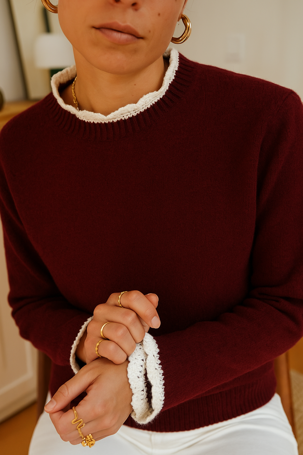 Deze fijne sweater heeft leuke crochet details in de kraag en de mouwen. Shop hem in brown!