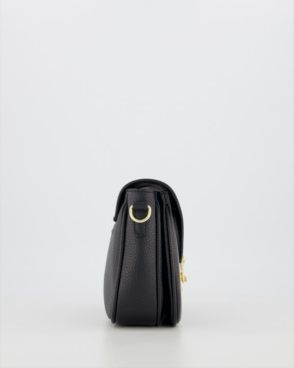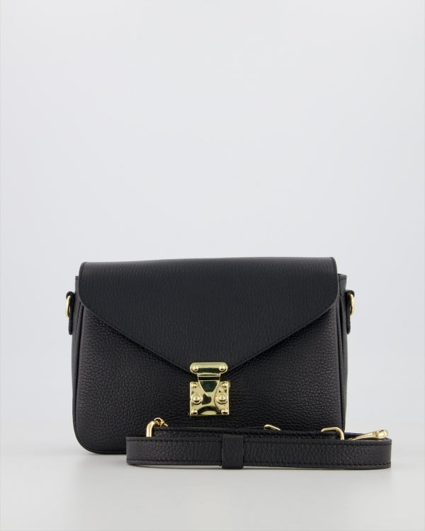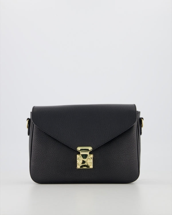 De Esther is een elegante schoudertas van generfd leer met goudkleurige details, praktisch ingedeeld met vakken en rits, en voorzien van een verstelbare schouderriem. Tijdloos, stijlvol en functioneel.