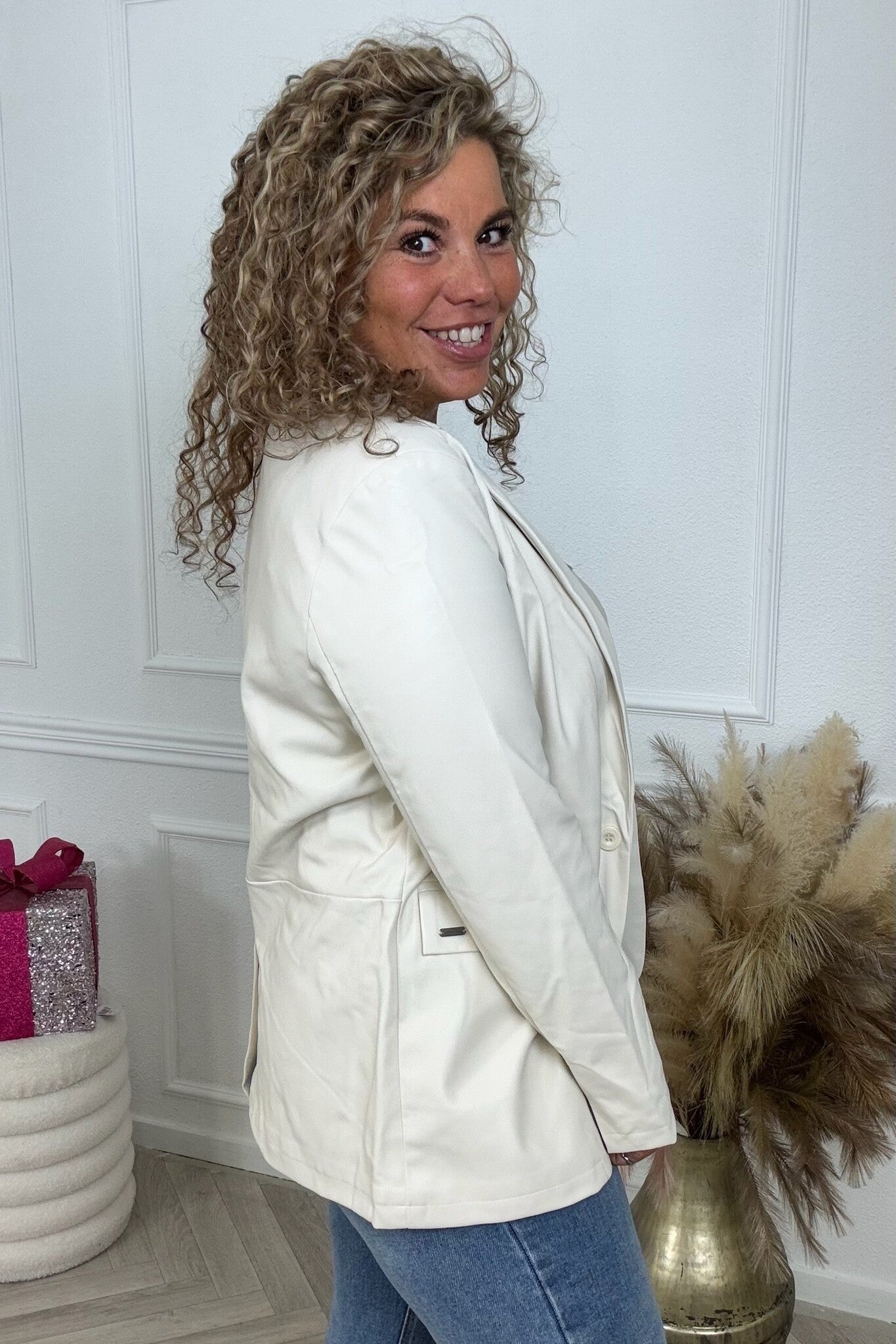 We hebben nu een geweldige blazer in een leer lookje! Shop hem nu in kit.
