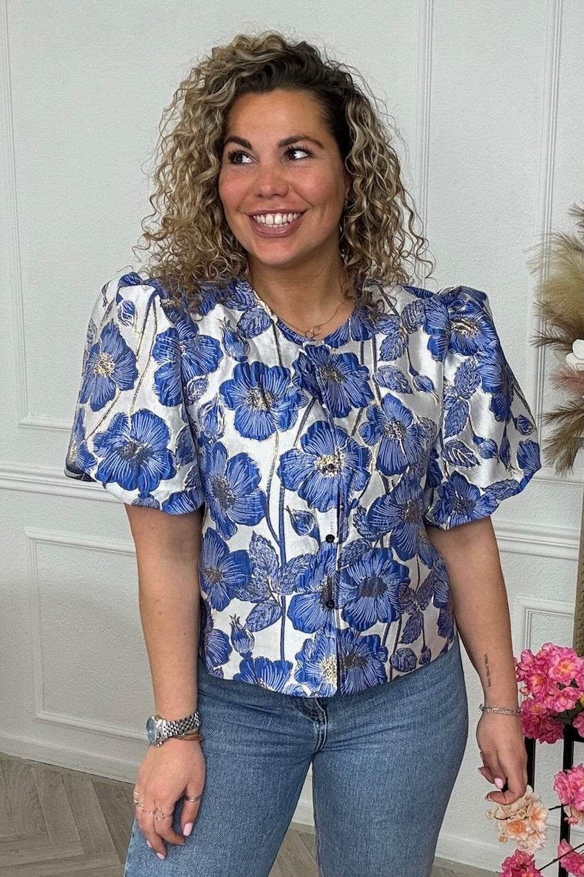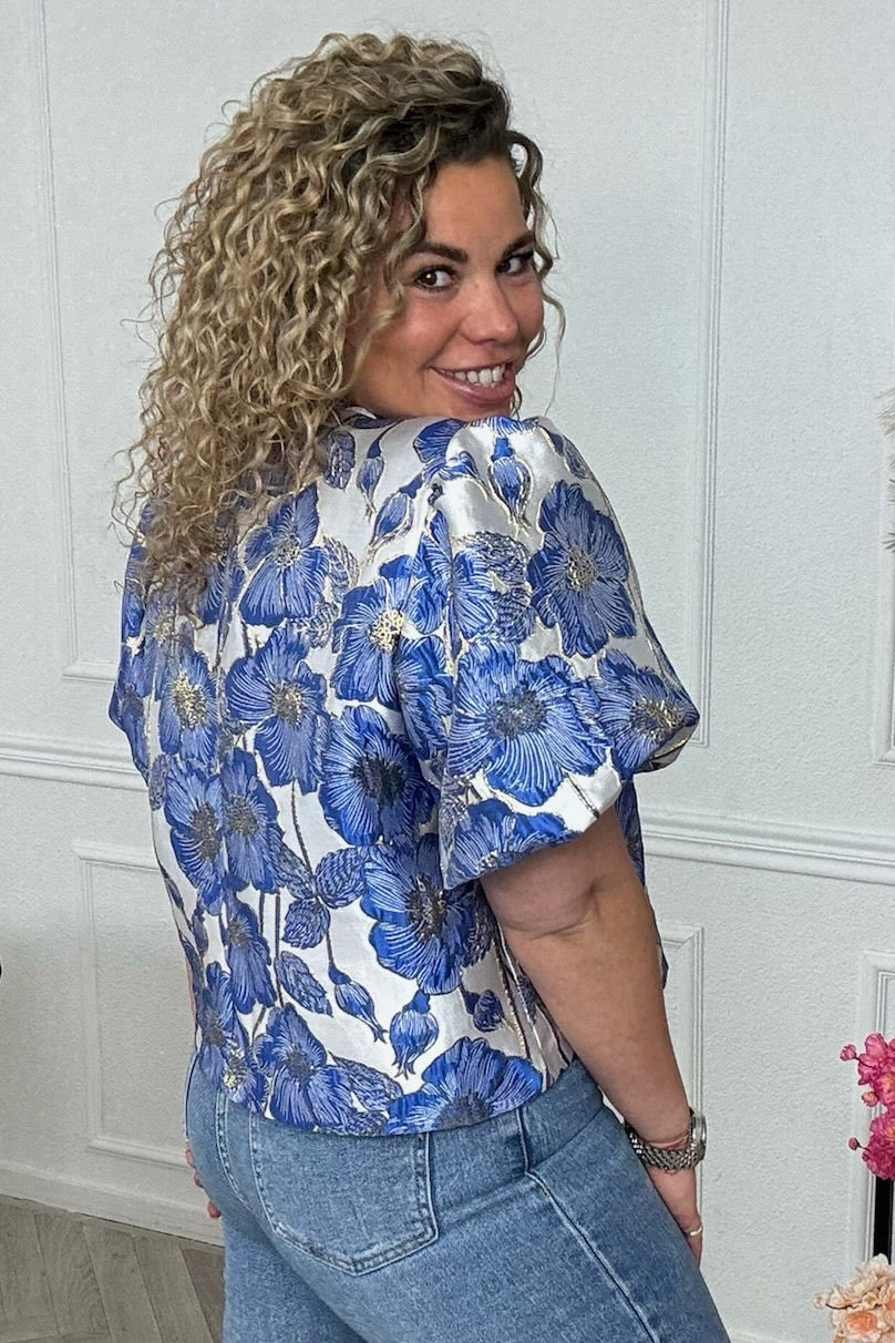 Deze prachtige top met korte ballon mouwen zorgt voor een mooie classy look. Hij is dicht te dragen tot maat 44 en open als jasje te dragen tot maat 48. Shop hem nu in kobalt!
