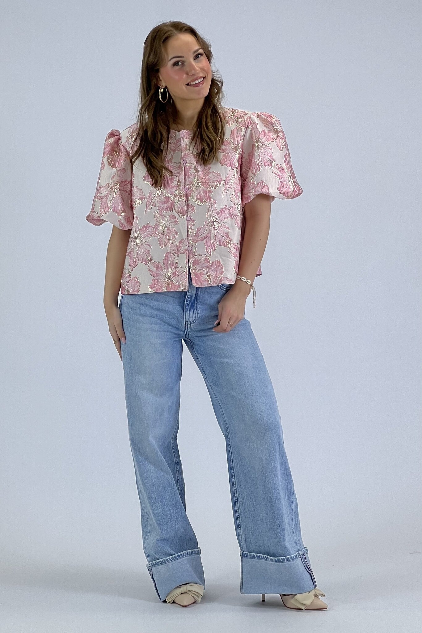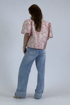 Flower Balloon Sleeve Blouse - Pink