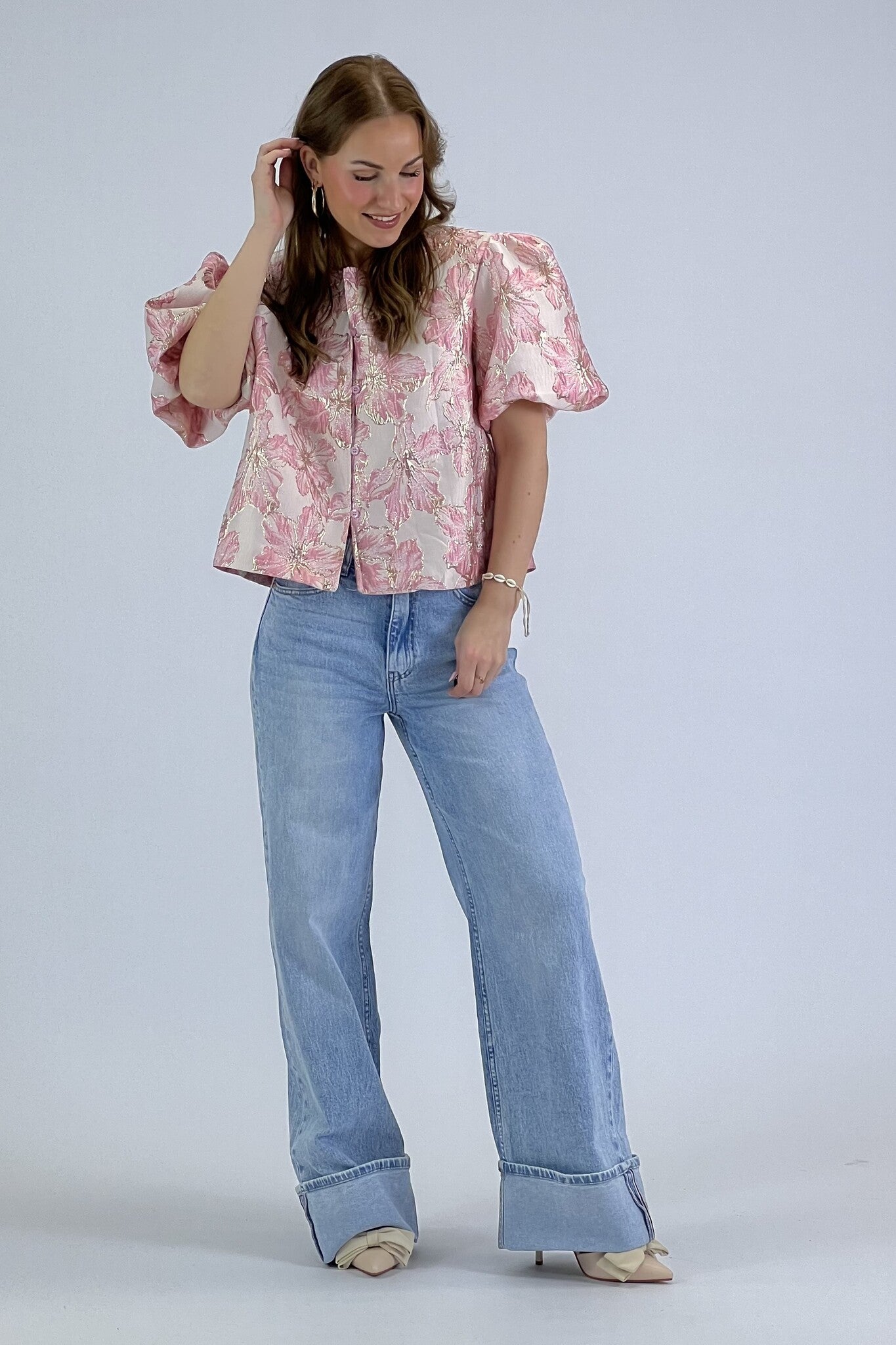 Deze prachtige top met korte ballon mouwen zorgt voor een mooie classy look. Hij is dicht te dragen tot maat 44 en open als jasje te dragen tot maat 48. Shop hem nu in Pink!