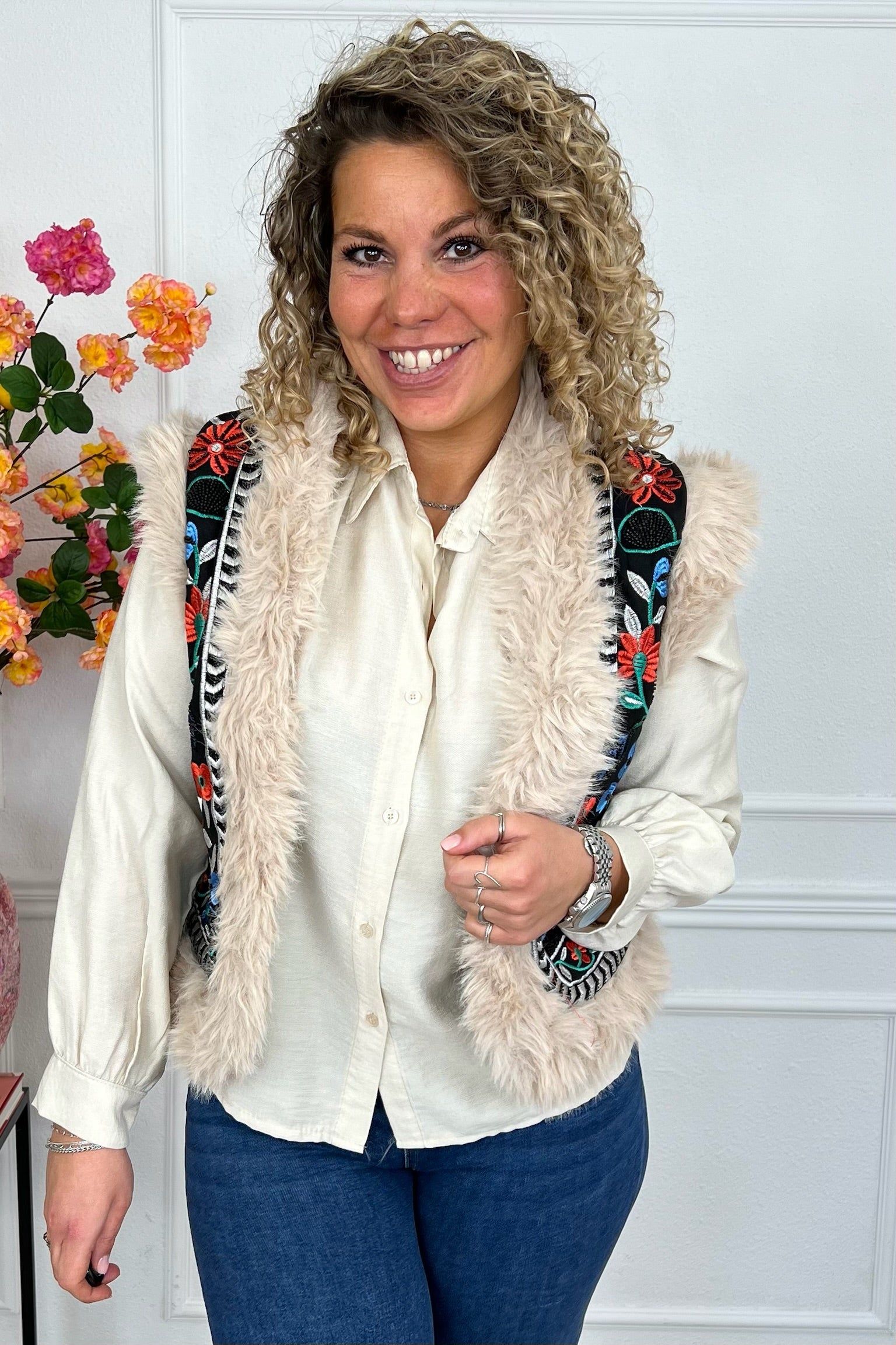 Dit leuke gilet is perfect! Het gilet heeft een mooie kraag van bont. Shop hem in Black/Beige!