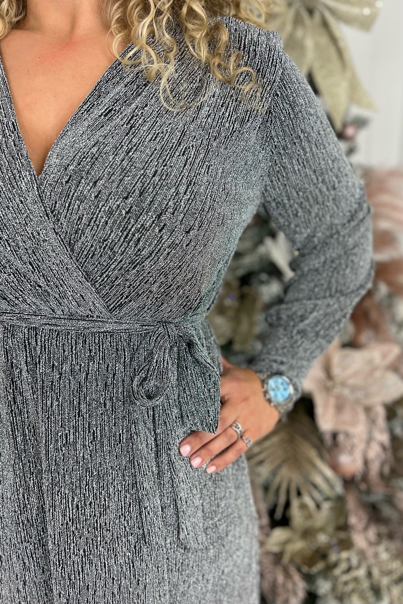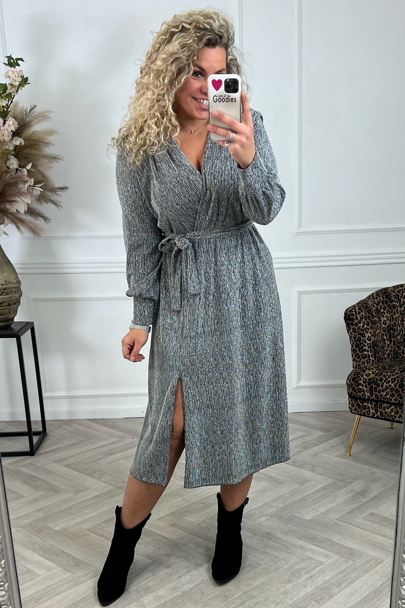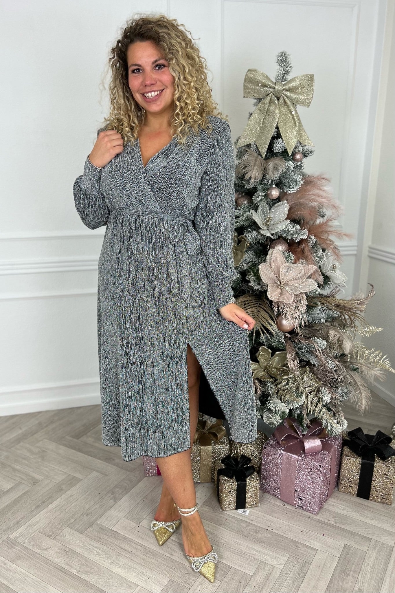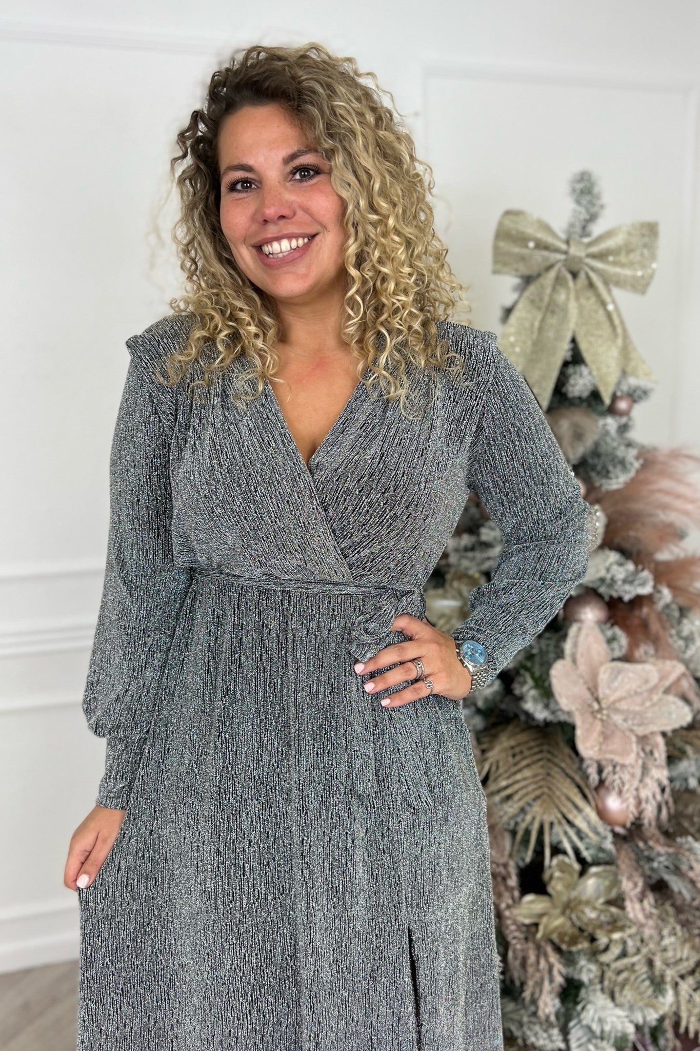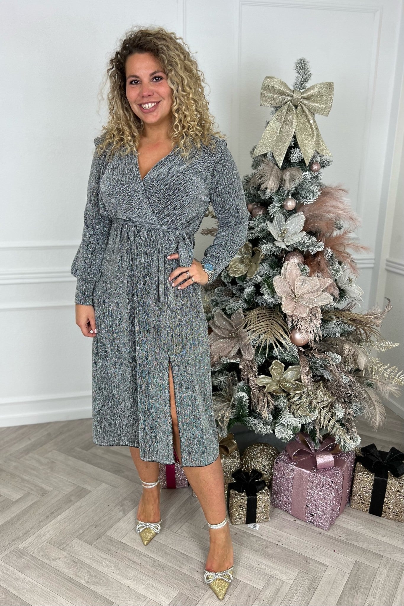 Een prachtige glitter jurk met schouder details, strik en een split! Perfect voor de feestdagen! hop hem in silver!