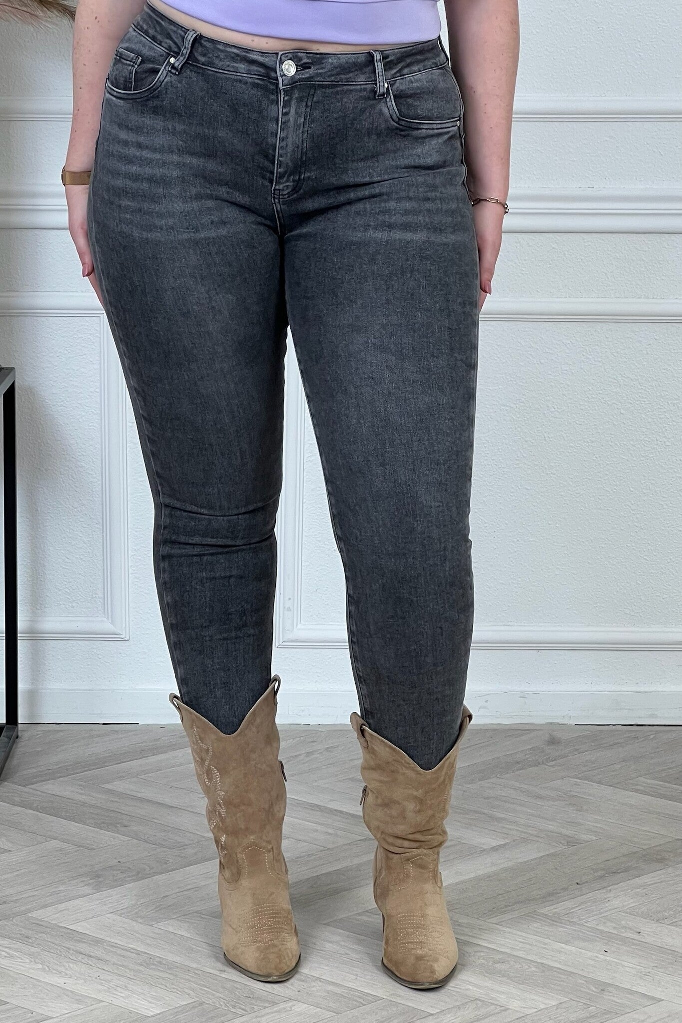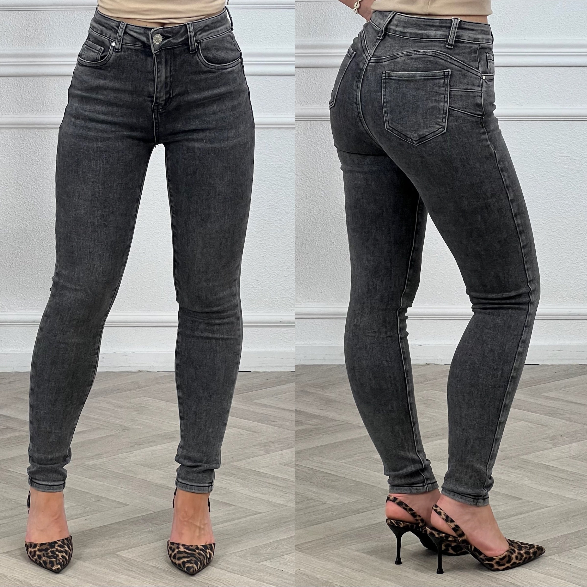 Een mooie Goodies skinny jeans! Wat een fijne broek! Shop hem in Dark Grey! Shop de look!