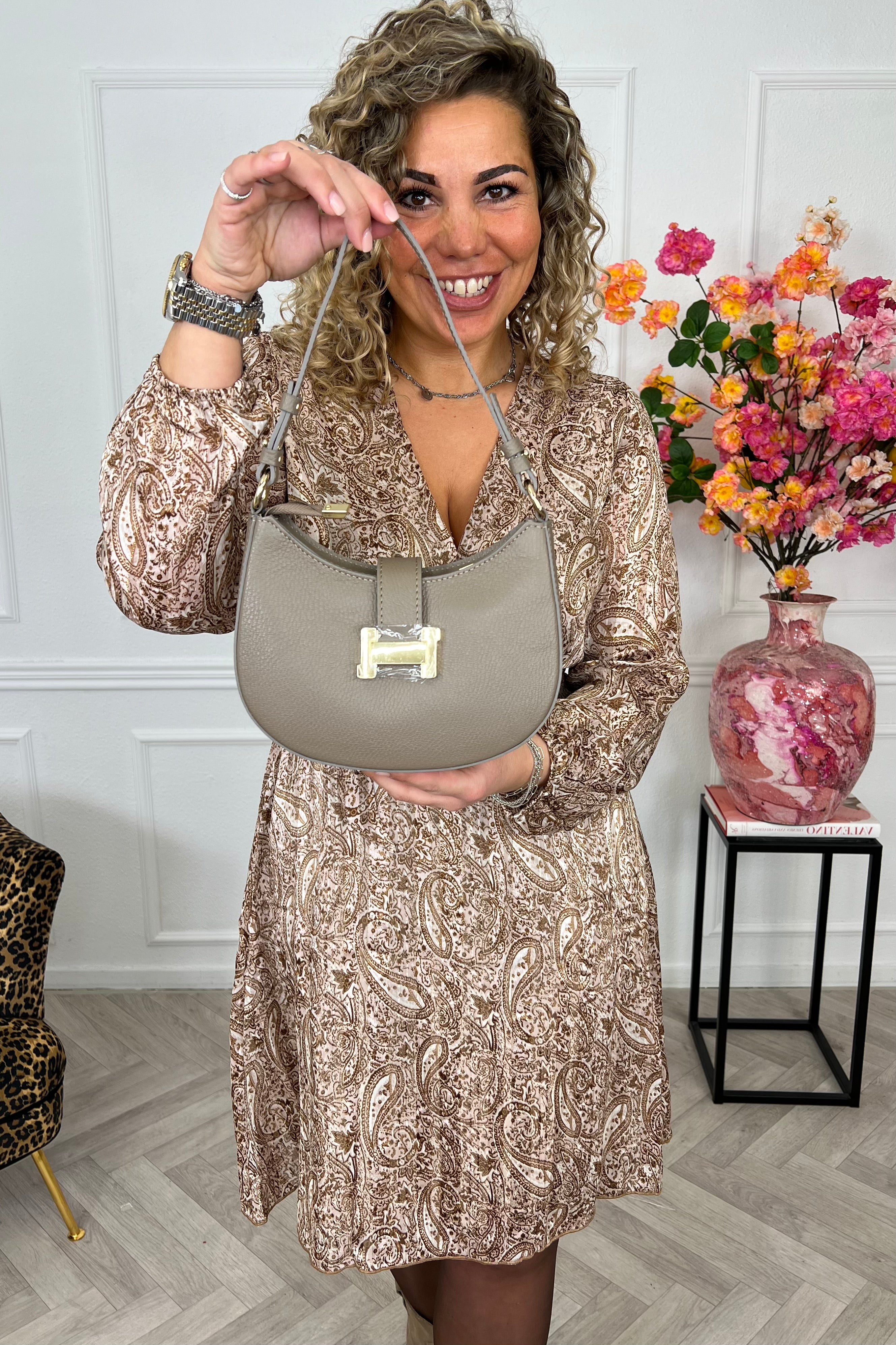 De Inez schoudertas is een elegante tas van Taupe generfd leer met goudkleurige details. Dankzij het verstelbare hengsel is de tas zowel als schoudertas en crossbody te dragen. De ritssluiting zit netjes verborgen onder een leren flap met stijlvolle gesp. Een tijdloos en praktisch ontwerp voor elke gelegenheid.