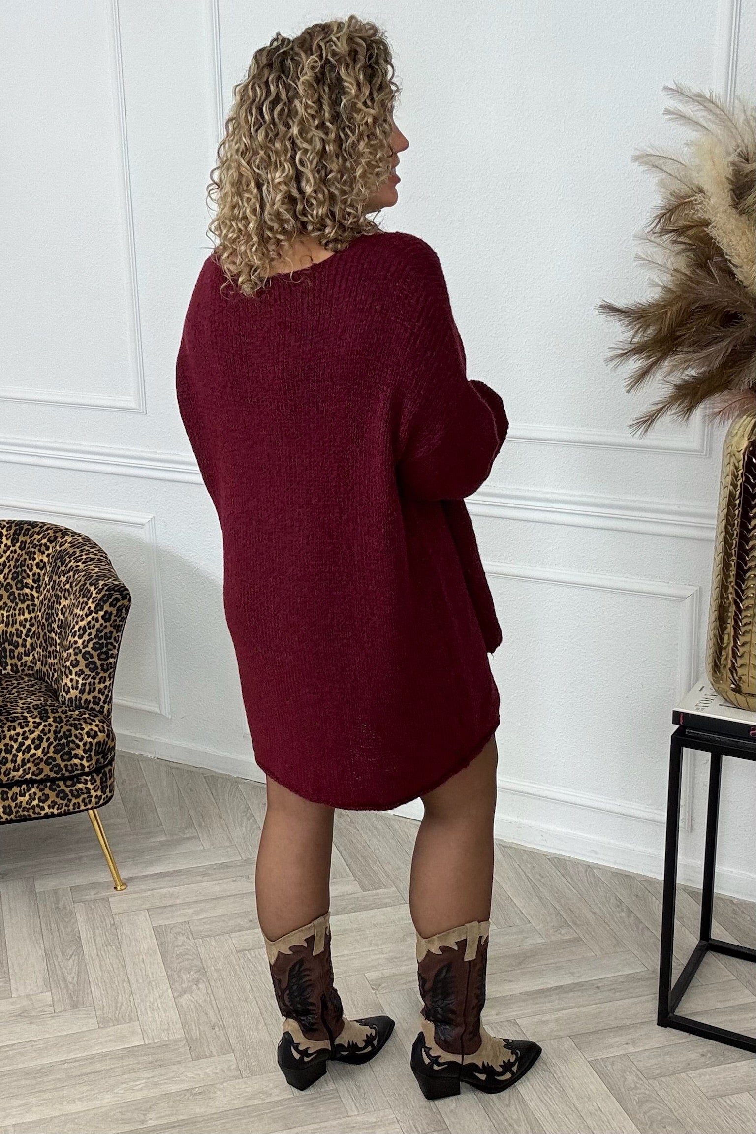 Een heerlijke knitted dress met een leuk sjaaltje erbij! Shop de knitted scarf dress nu in bordeaux!