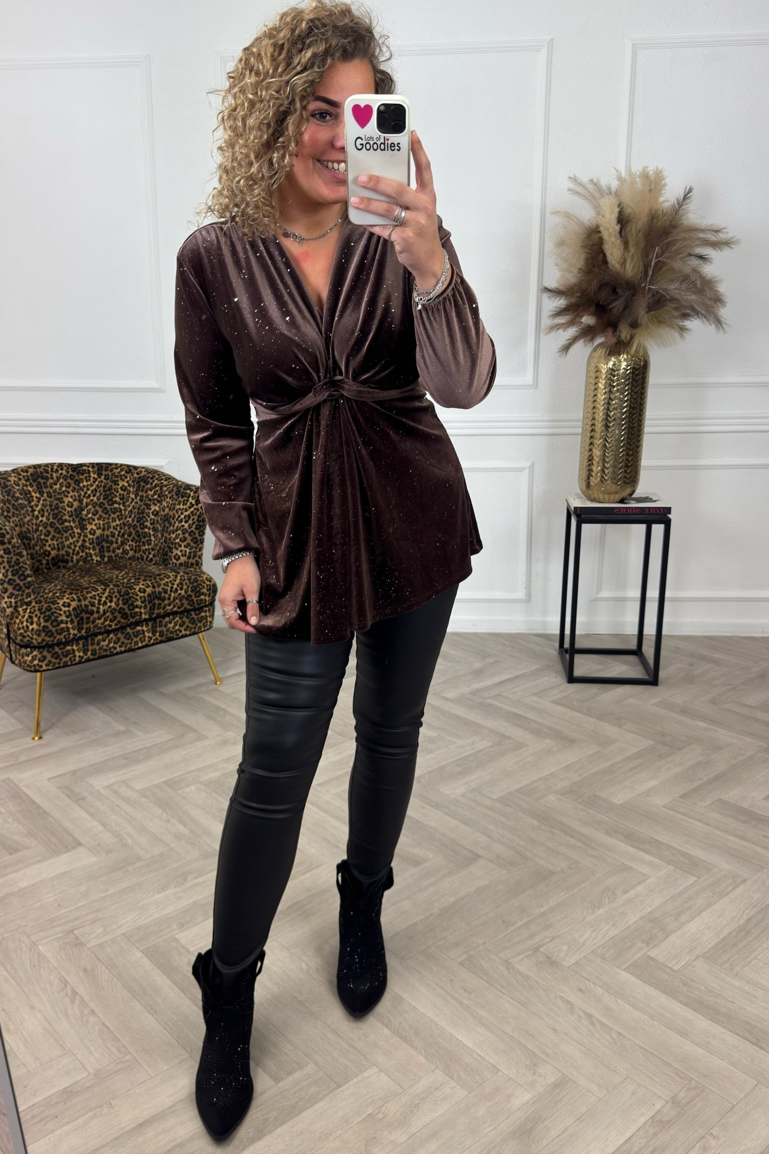 Een enige top, waarmee je zeker op een goede manier opvalt! Shop de knotted velvet sparkle nu in het brown!