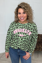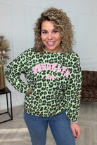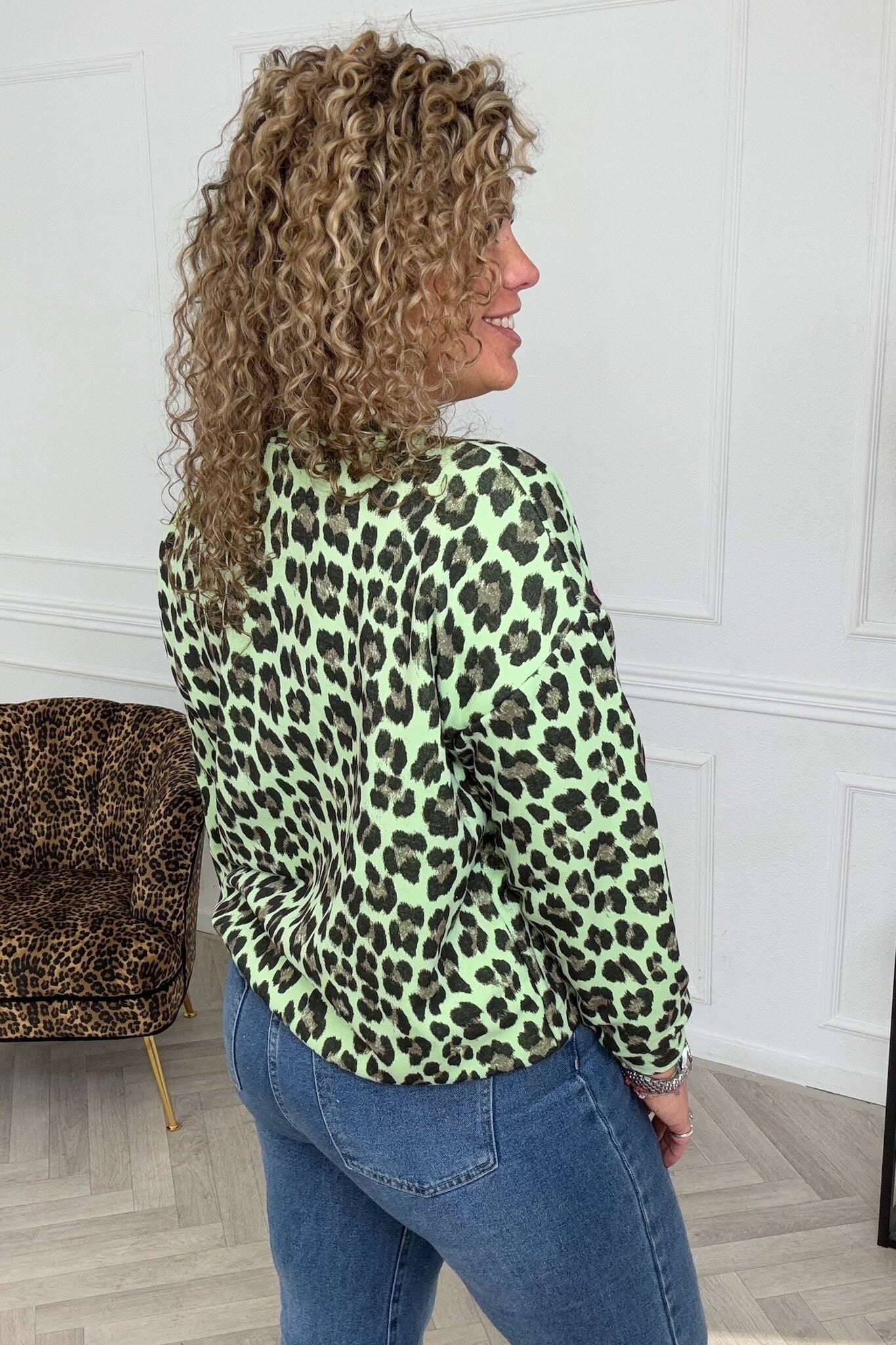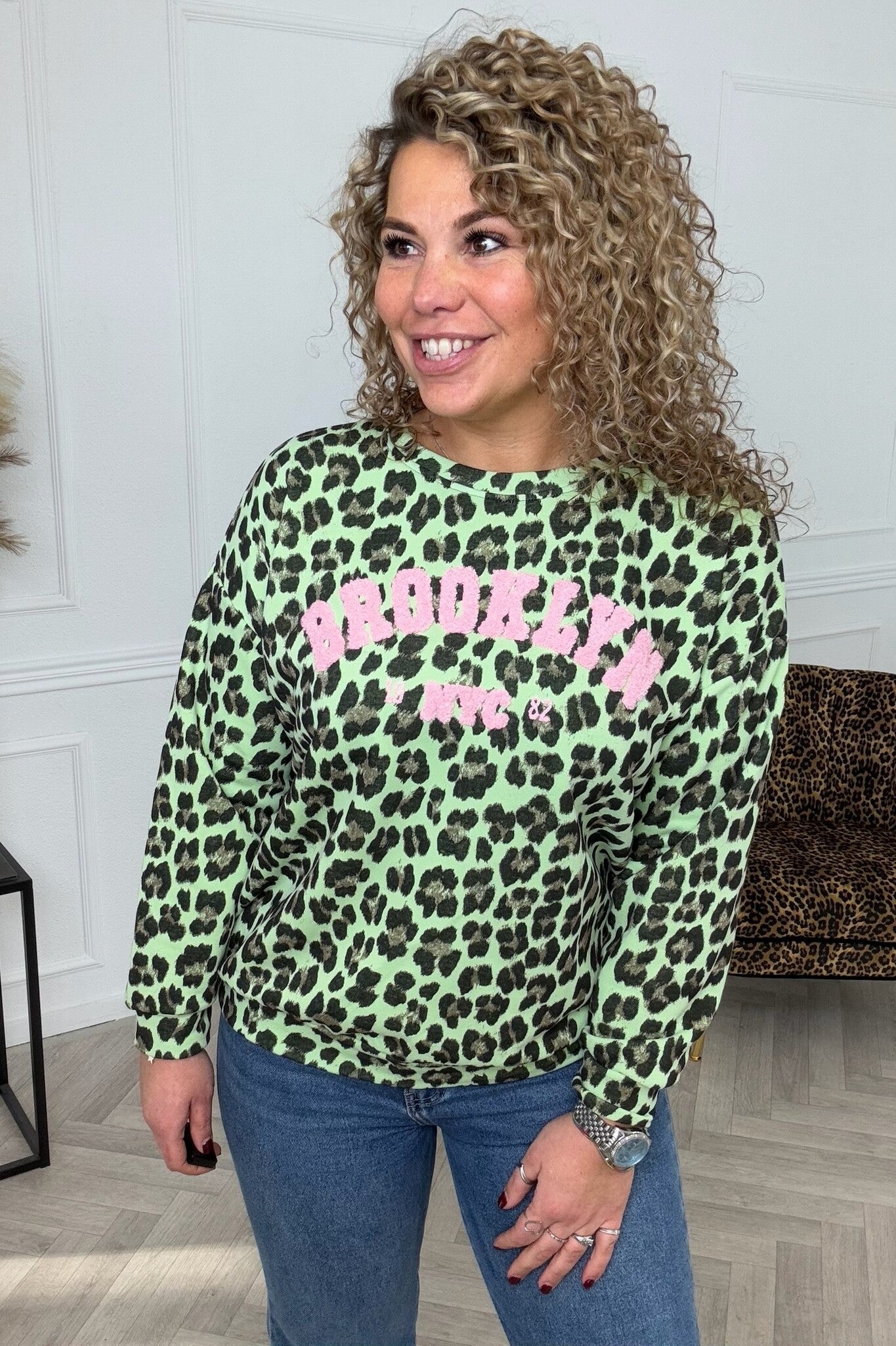 Deze super zachte sweater heeft een heerlijk panter printje met groene en roze details. Shop hem nu in leopard/green.