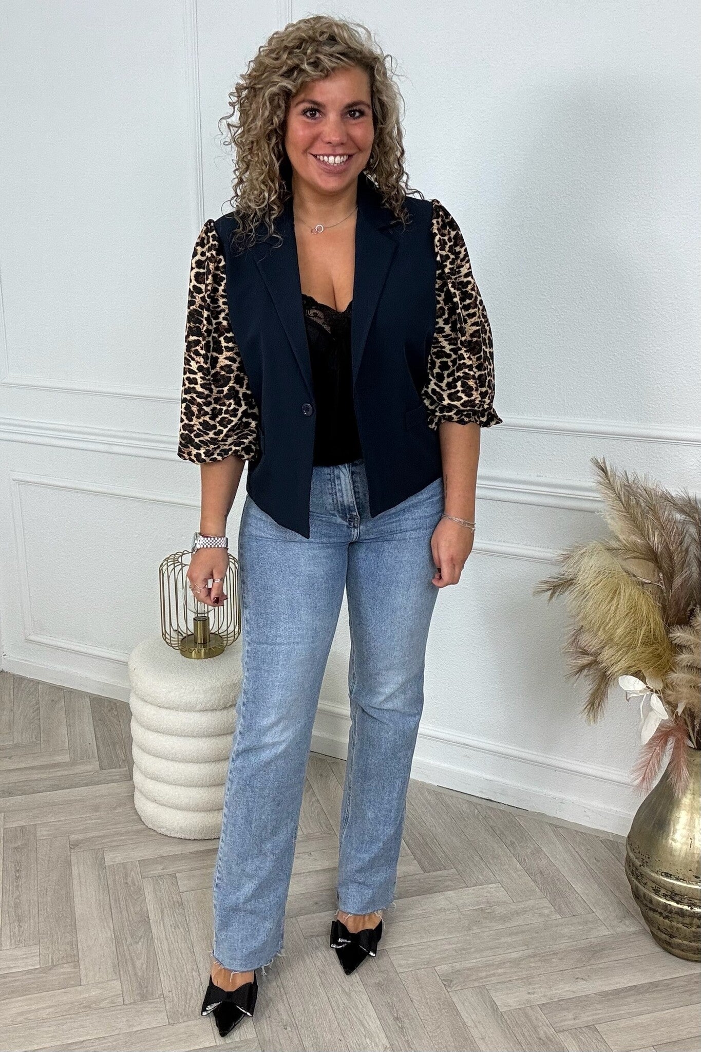 Wat een prachtige blazer! Prachtig afgewerkt met leopard mouwen! Shop hem nu in navy.