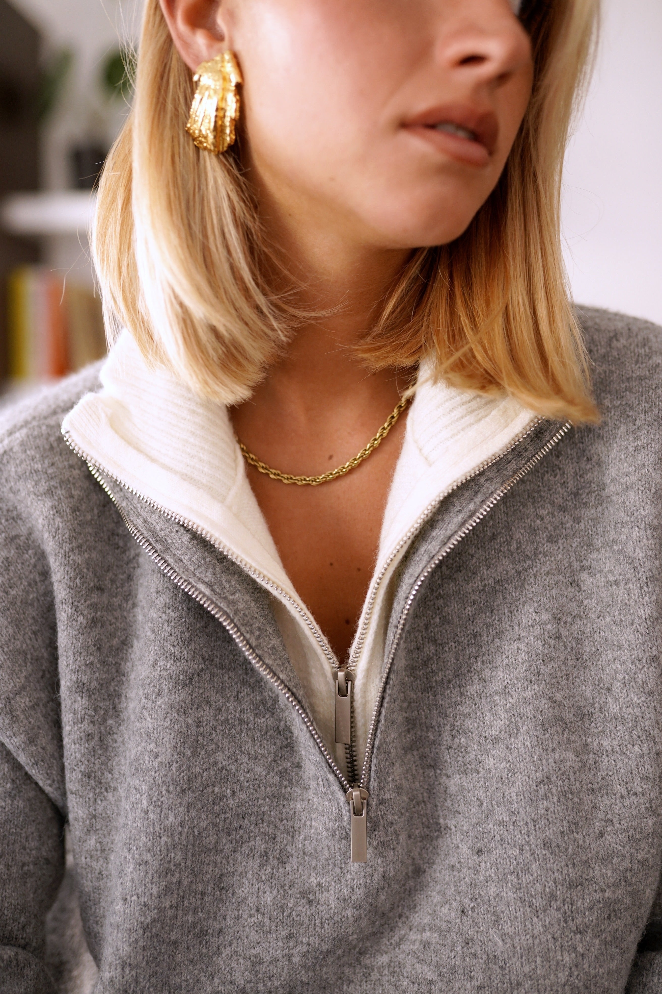 Deze classy grijze trui heeft een dubbele kraag, een grijze met witte kraag eronder. Shop hem nu nieuw online!