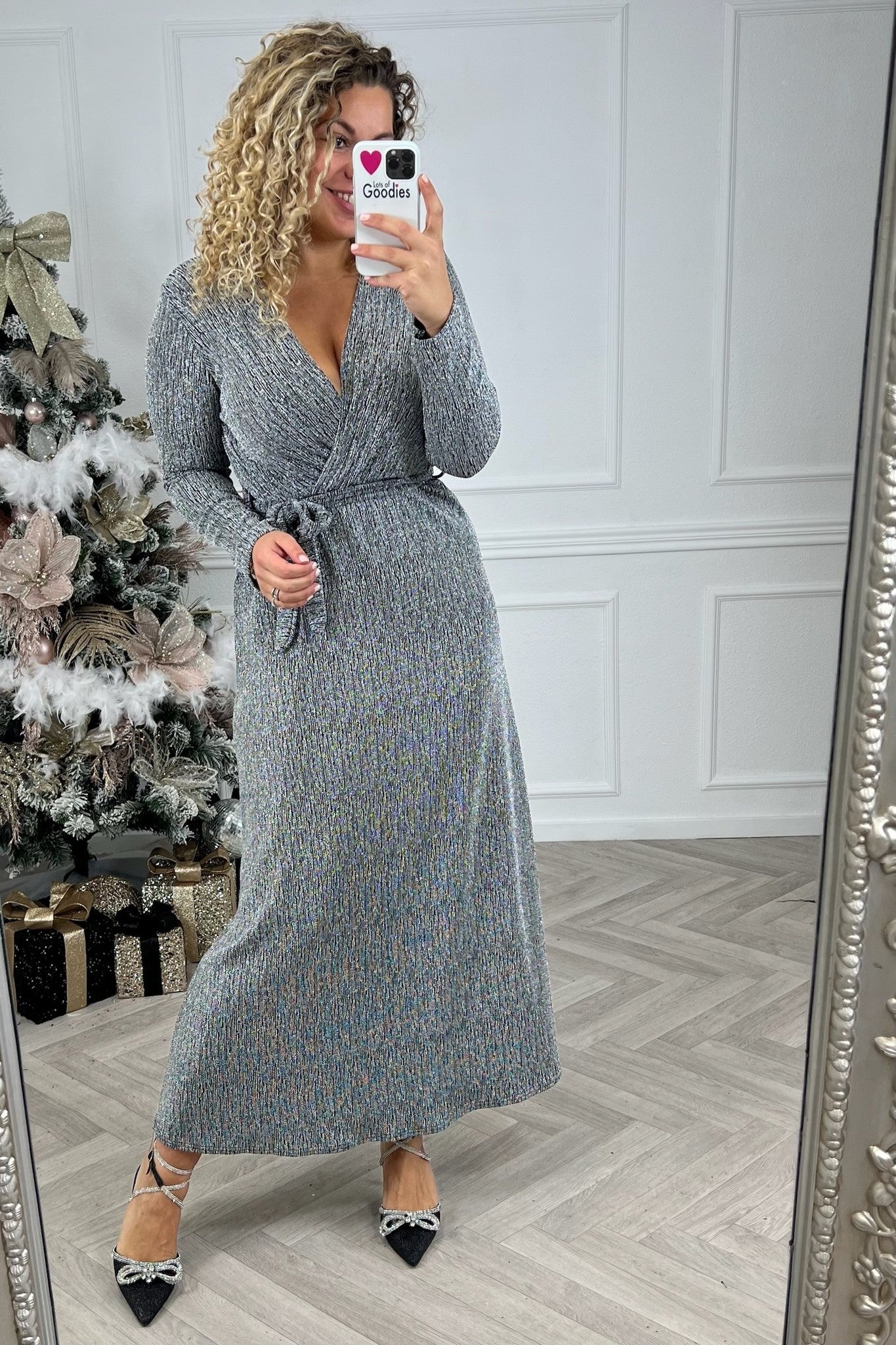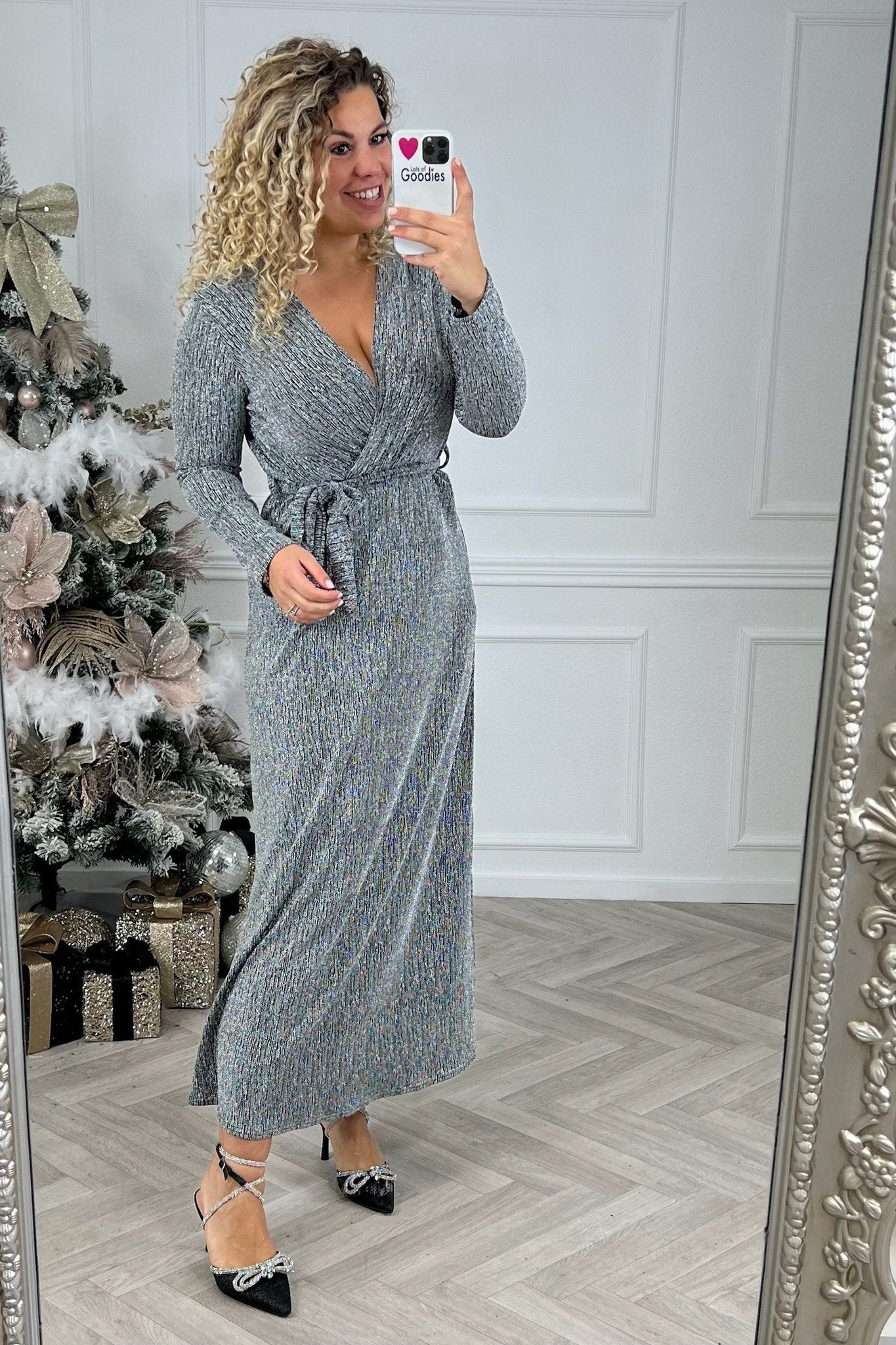 Deze mooie sparkle jurk heeft lange mouwen een elastieke band en een ceintuur. Prachtige maxi lengte.